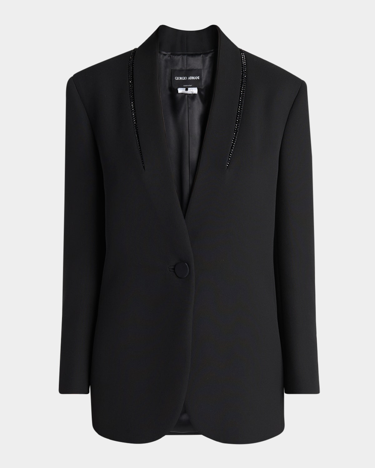- Giorgio Armani silk tuxedo jacket embellished with beaded lapels - Single-breasted front - Long sleeves with button cuffs - Side seam pockets - Tailored fit - Vented back - Rounded hem - Button-front - Silk - Dry clean - Made in Italy