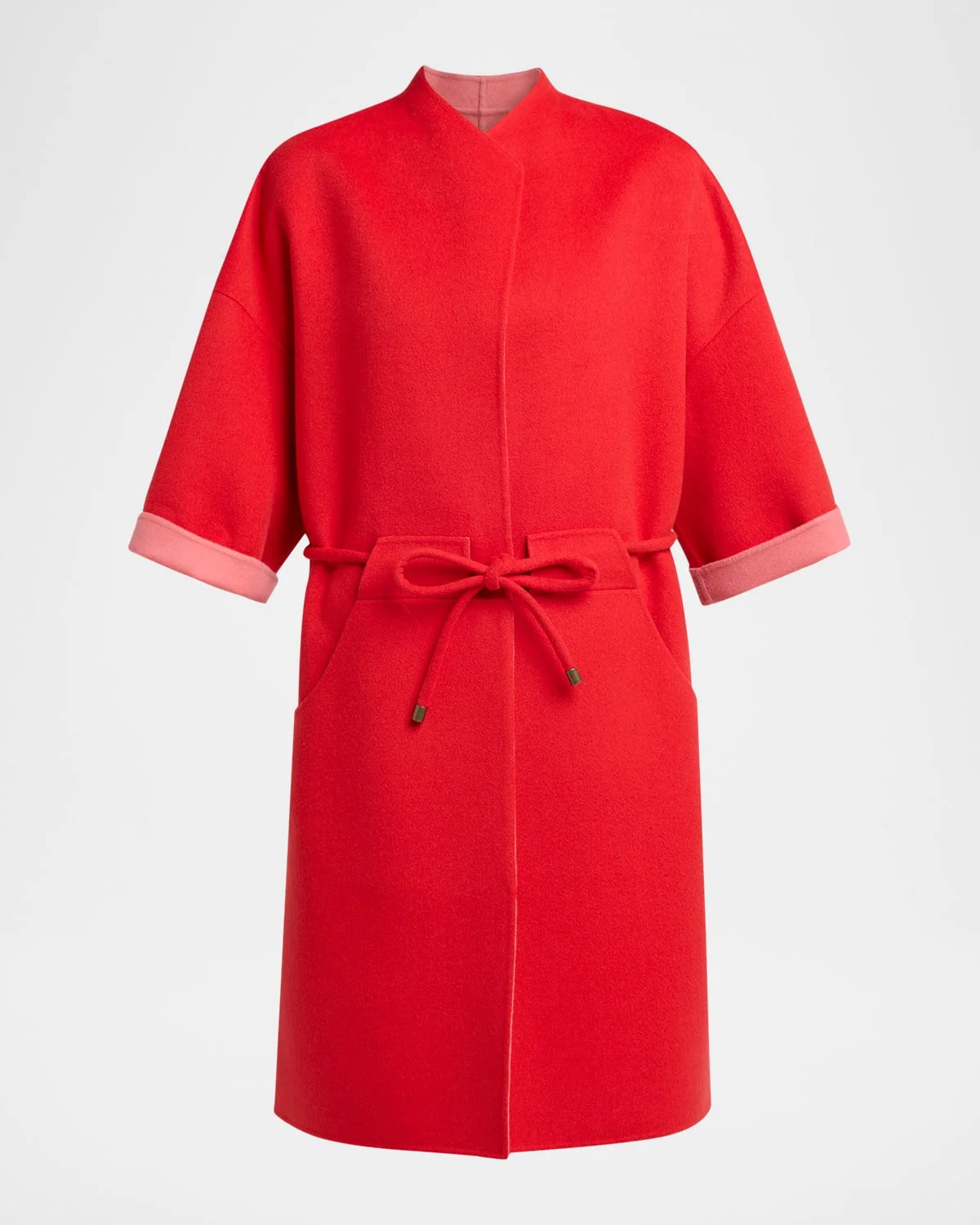 Crafted from virgin wool, this longline coat by Giorgio Armani features a bicolor design Collarless neckline; single-breasted front Elbow-length cuffed sleeves Self-tie belted waist Hem hits around the knee Relaxed fit Virgin wool Dry clean Made in Italy