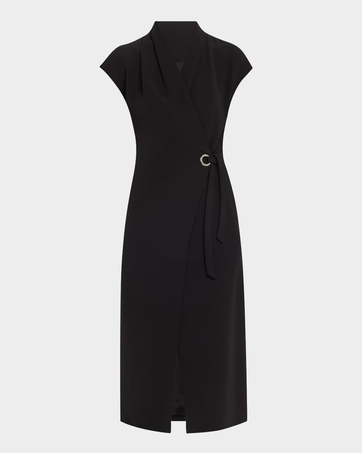 - Giorgio Armani cupro wrap dress featuring pleated shoulder details and a grommet side tie - Surplice neckline - Cap sleeves - Sheath silhouette - Hem falls below the knee - Self-tie waist closure - Silk - Dry clean - Made in Italy