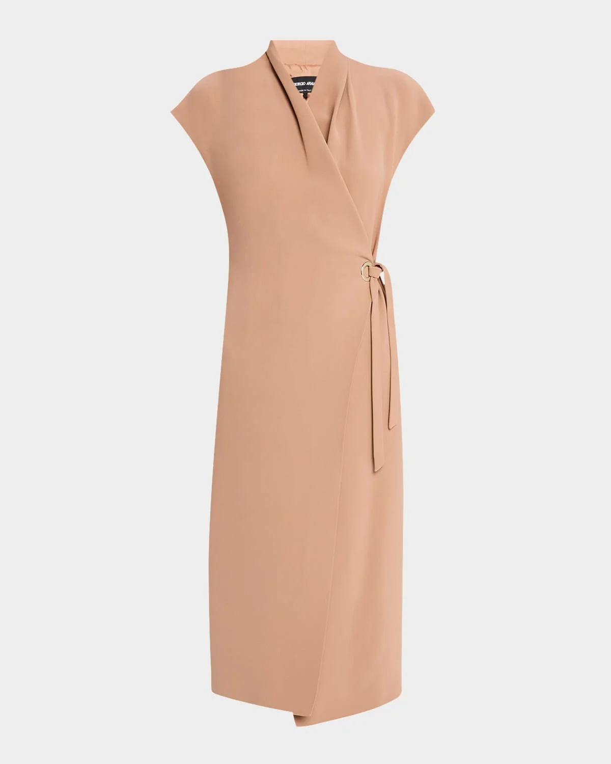 - Giorgio Armani cupro wrap dress featuring a waist tie - Shawl surplice neckline - Cap sleeves - Sheath silhouette - Hem falls below the knee - Self-tie waist closure - Silk - Dry clean - Made in Italy