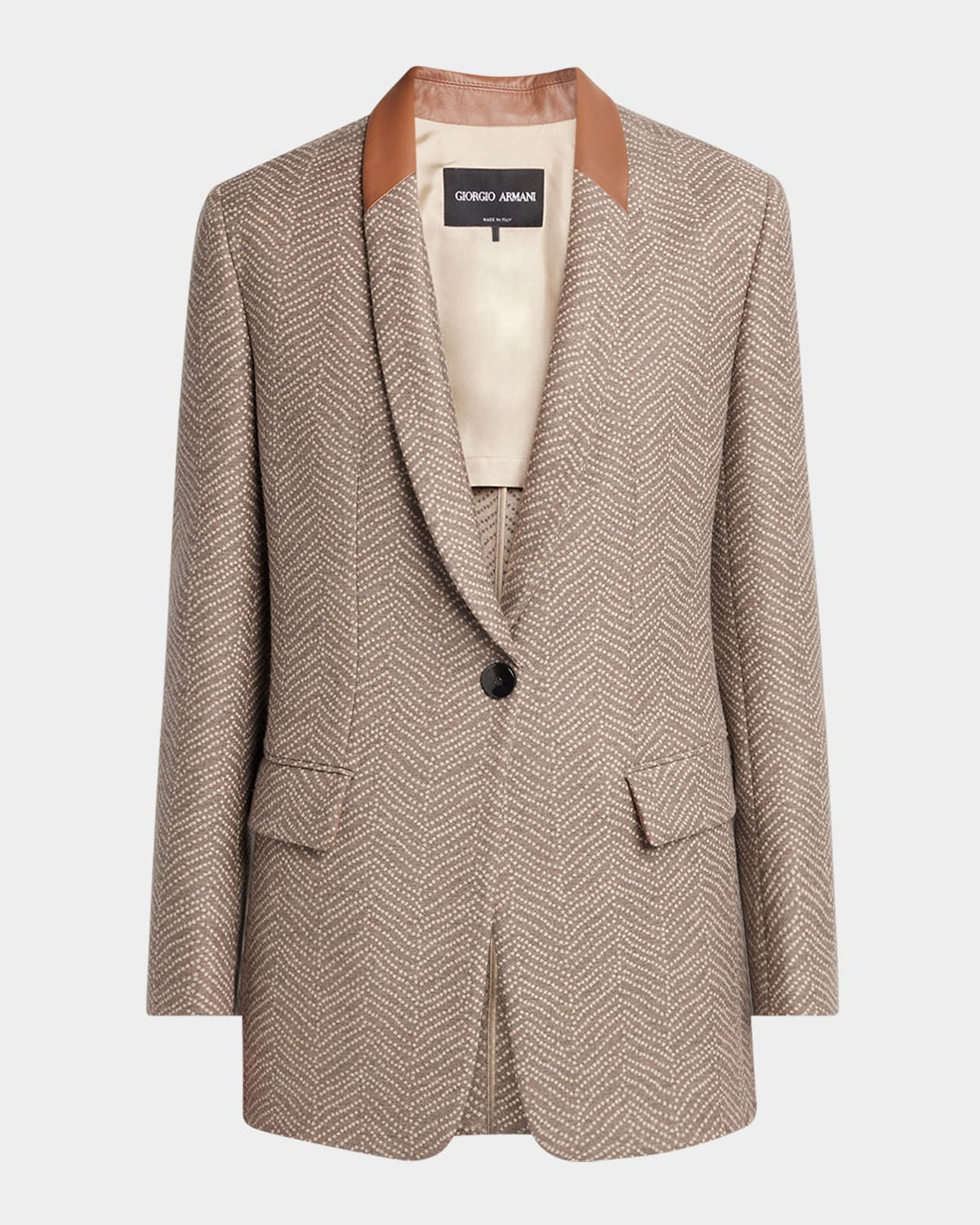 Chevron Wool Single-Breasted Blazer with Leather Trim