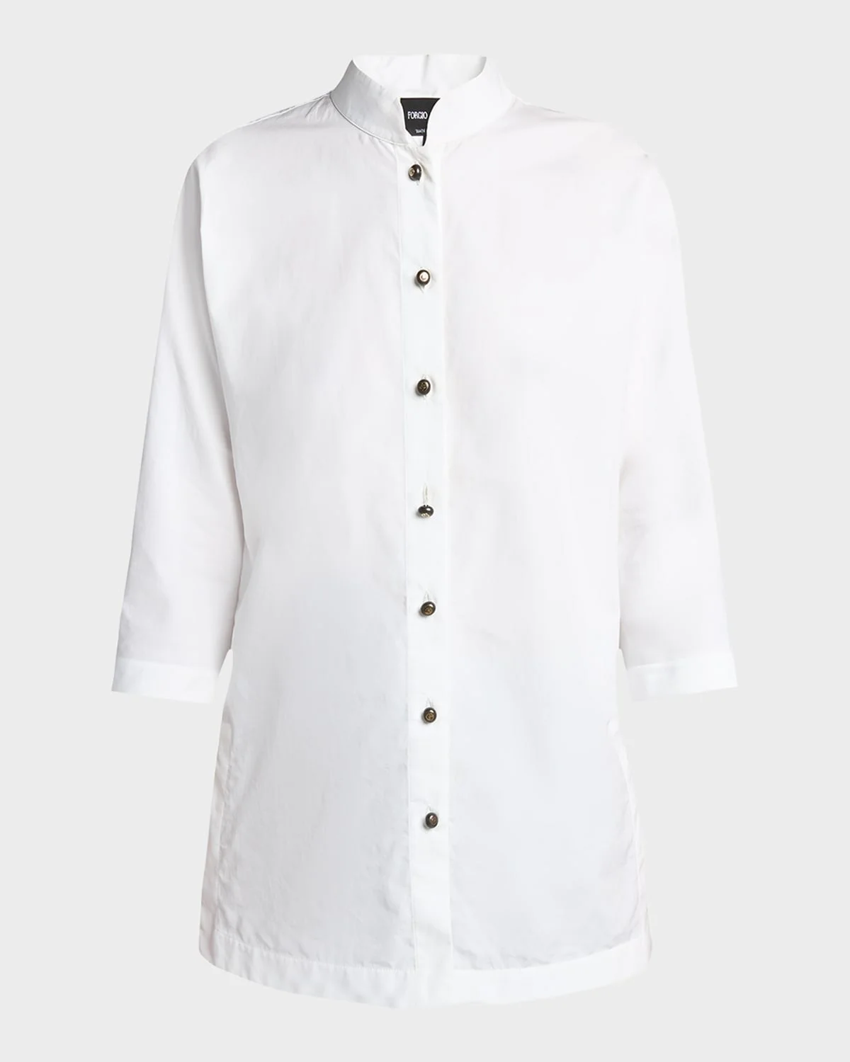 Crafted from crisp cotton poplin, this shirt from & nbsp;Giorgio Armani features monogram buttons Mandarin collar; button front Long sleeves Straight fit Hem falls below the hip Side slits Cotton Dry clean Made in Italy