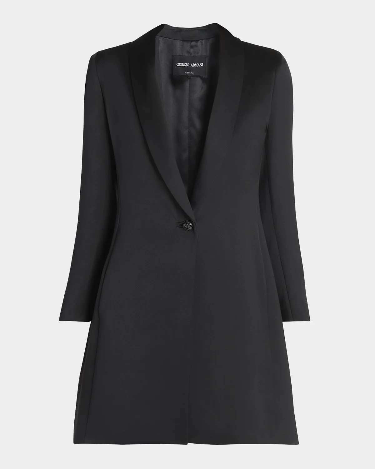 - Giorgio Armani silk jacket featuring a crystal encrusted button - Shawl collar; single-breasted front - Long sleeves - Side split pockets - A-line silhouette - Hem falls below the hip - Side slits - Silk - Dry clean - Made in Italy