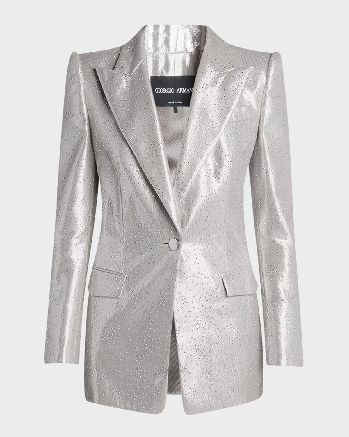 Giorgio Armani crystalembellished blazer Peak lapels; button front Long sleeves; button cuffs Chest welt pocket; hip flap pockets Tailored fit Silk/polyester/nylon/polyamide Dry clean Made in Italy
