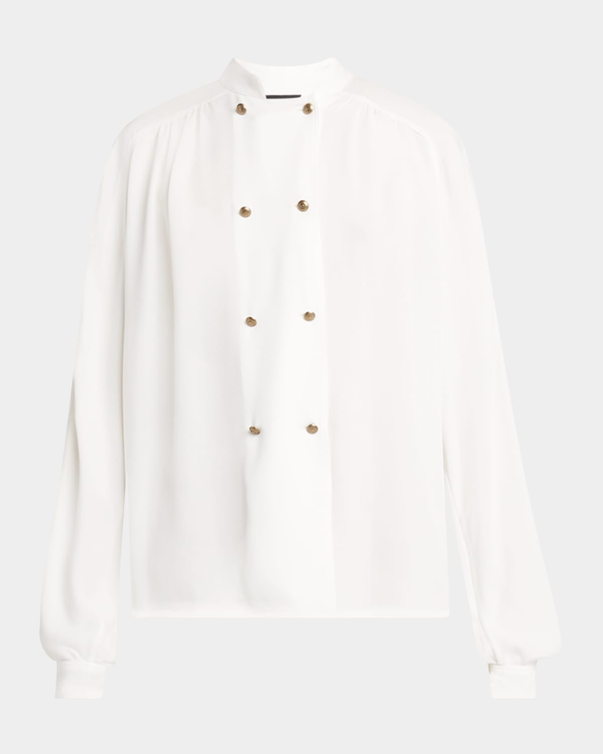 - Giorgio Armani blouse featuring a gathered shoulder yoke and a double breasted front - Mandarin collar; button front - Long sleeves; button cuffs - Yoked back; box pleat - Relaxed fit - Button closure - Silk - Dry clean - Made in Italy