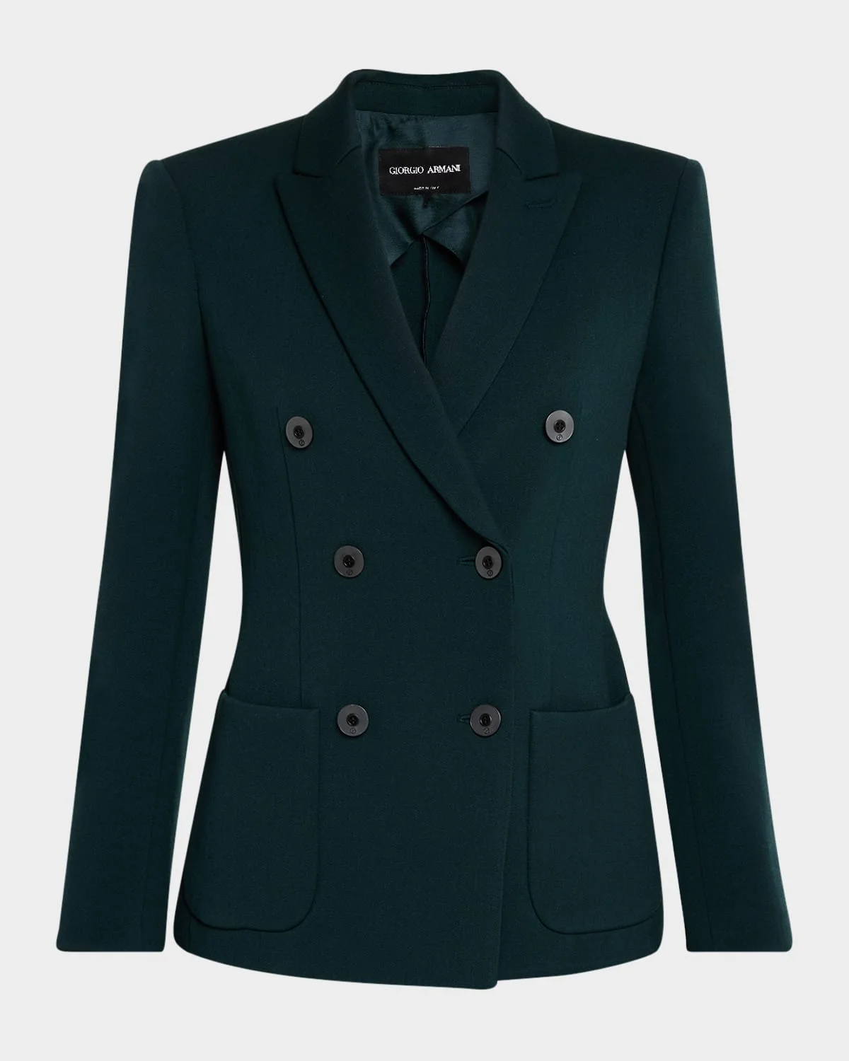Giorgio Armani doublebreasted stretch wool blazer jacket Peak lapel collar Tworow button closure Long sleeves Front patch pockets Back vent Midlength Relaxed fit Virgin wool/elastane Dry clean Made in Italy