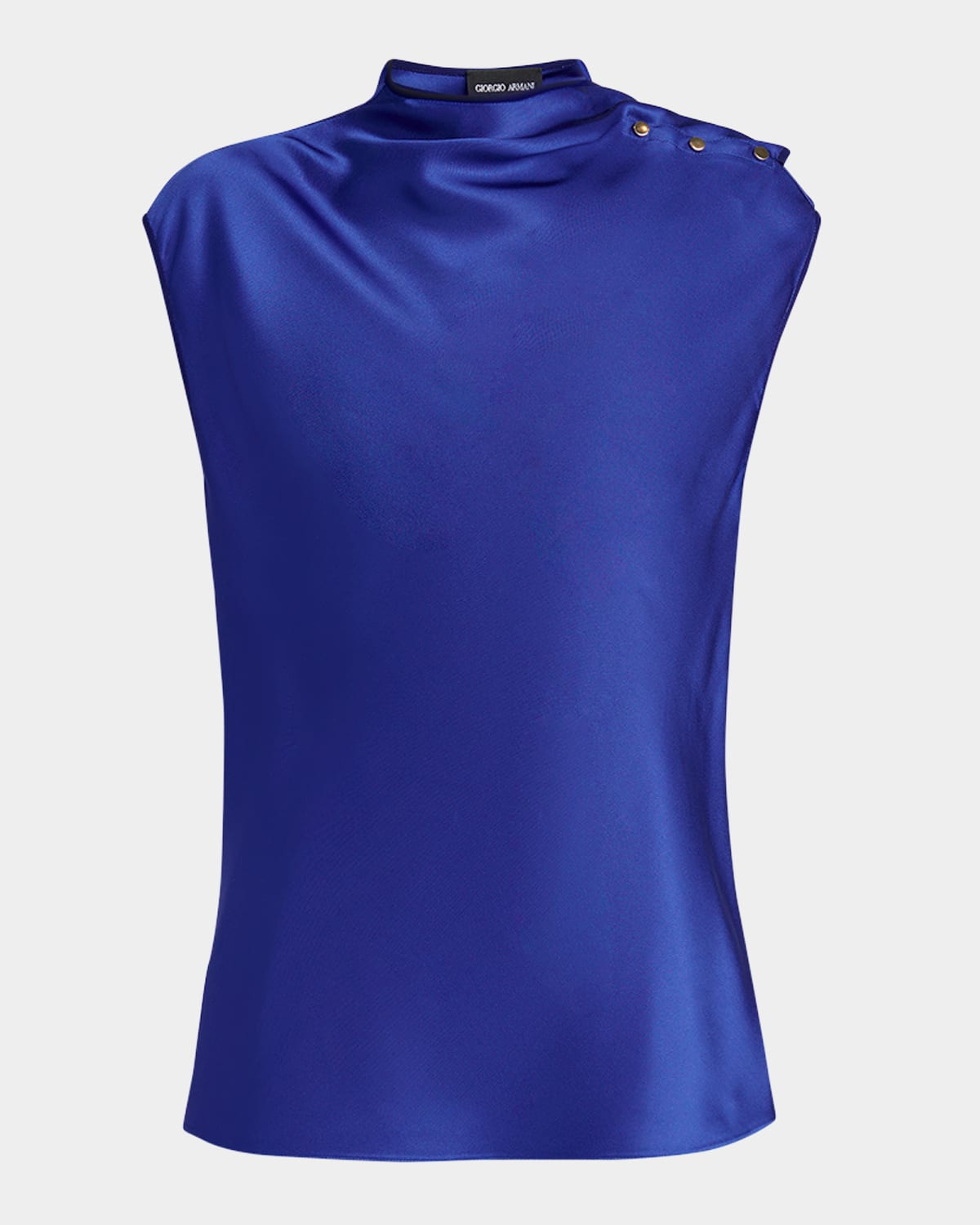 Giorgio Armani double satin blouse featuring a snap shoulder detail High neckline Cap sleeves Relaxed fit Silk Dry clean Made in Italy