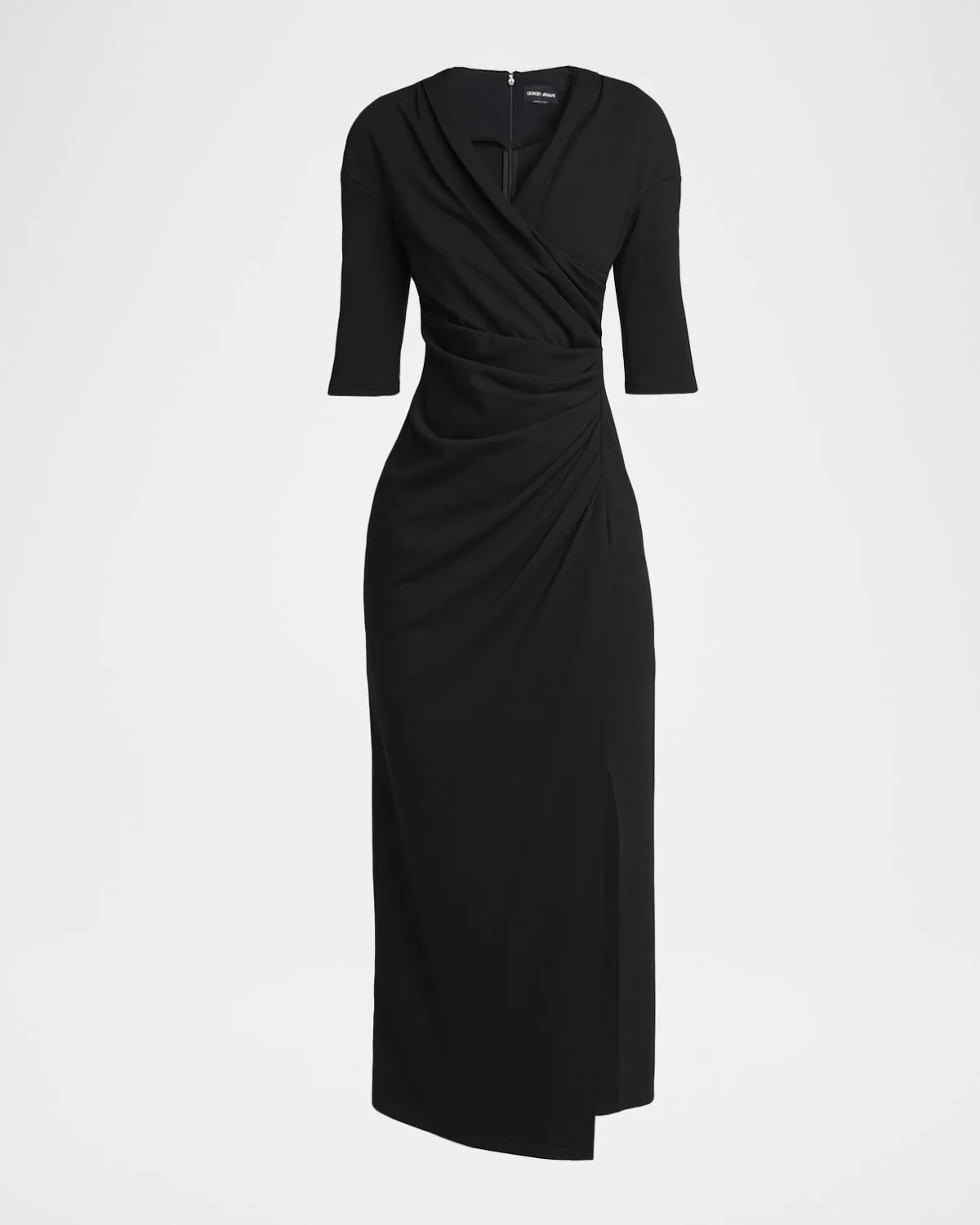 Elbow-Sleeve Draped Crepe Slit Midi Dress