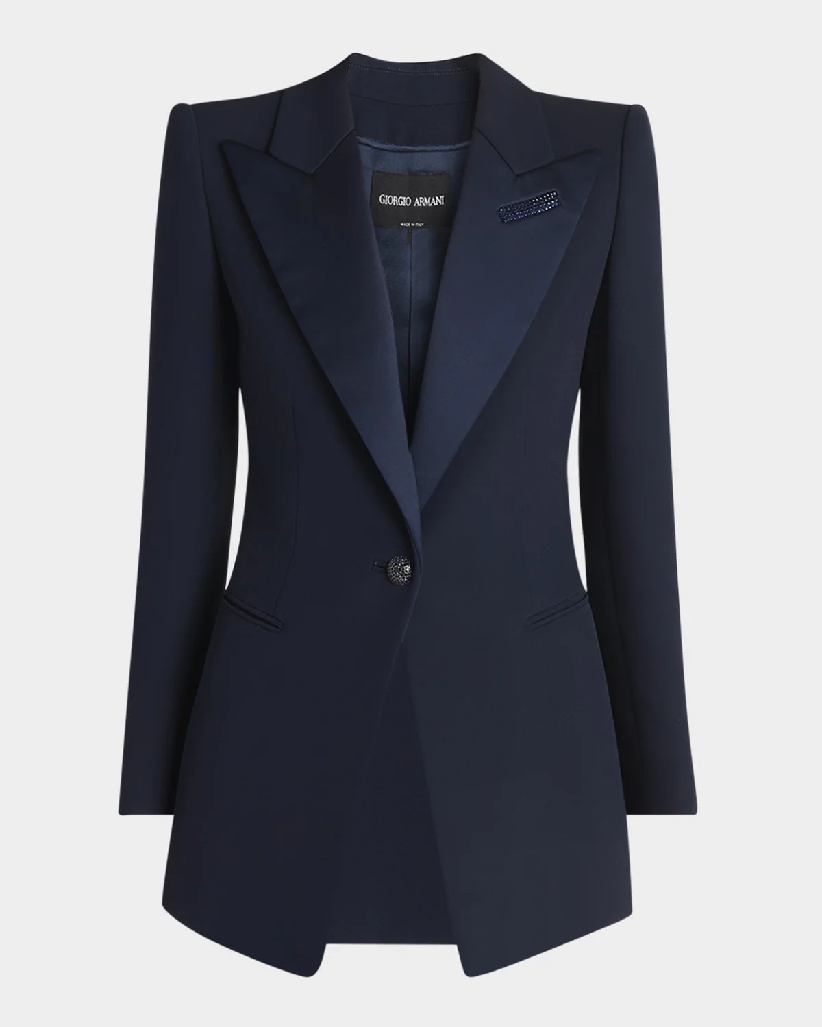 Giorgio Armani tuxedo jacket featuring satin lapels with a strass embellished detail, and a crystal encrusted button Peak lapels; singlebreasted front Long sleeves; unfinished cuffs Side welt pockets Slim fit Hem falls below the hip Silk Dry clean Made in Italy