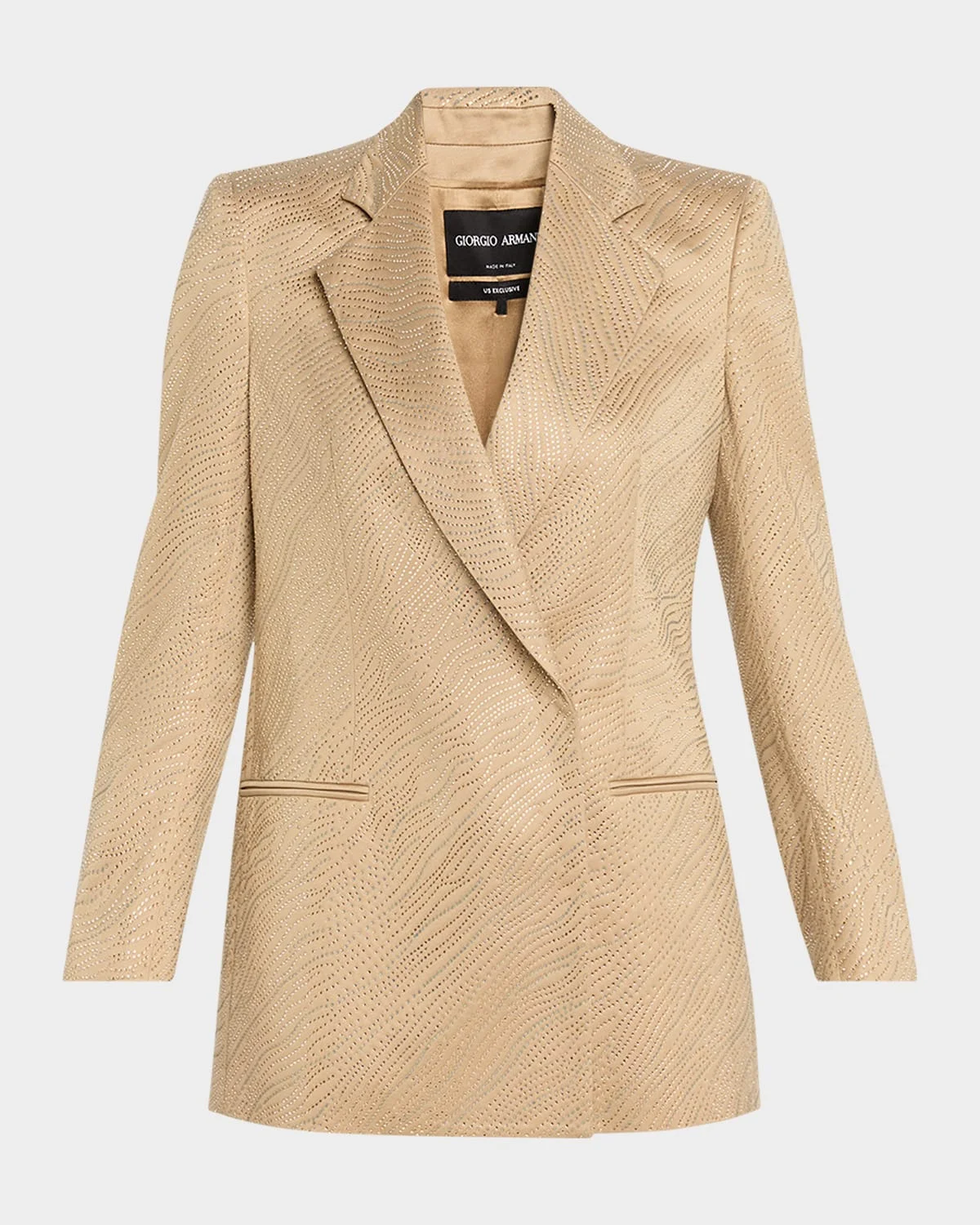 Crafted from lustrous silk, this blazer jacket from Giorgio Armani shimmers with allover wavy strass embellishment Notch lapels; double-breasted front Long sleeves Padded shoulders Hip double welt pockets Straight fit Hem falls below the hip Concealed front closure Silk/nylon/polyamide Made in Italy SIZE & FITModel measurements: 5 & apos;10" tallModel is wearing a US size 4/Small