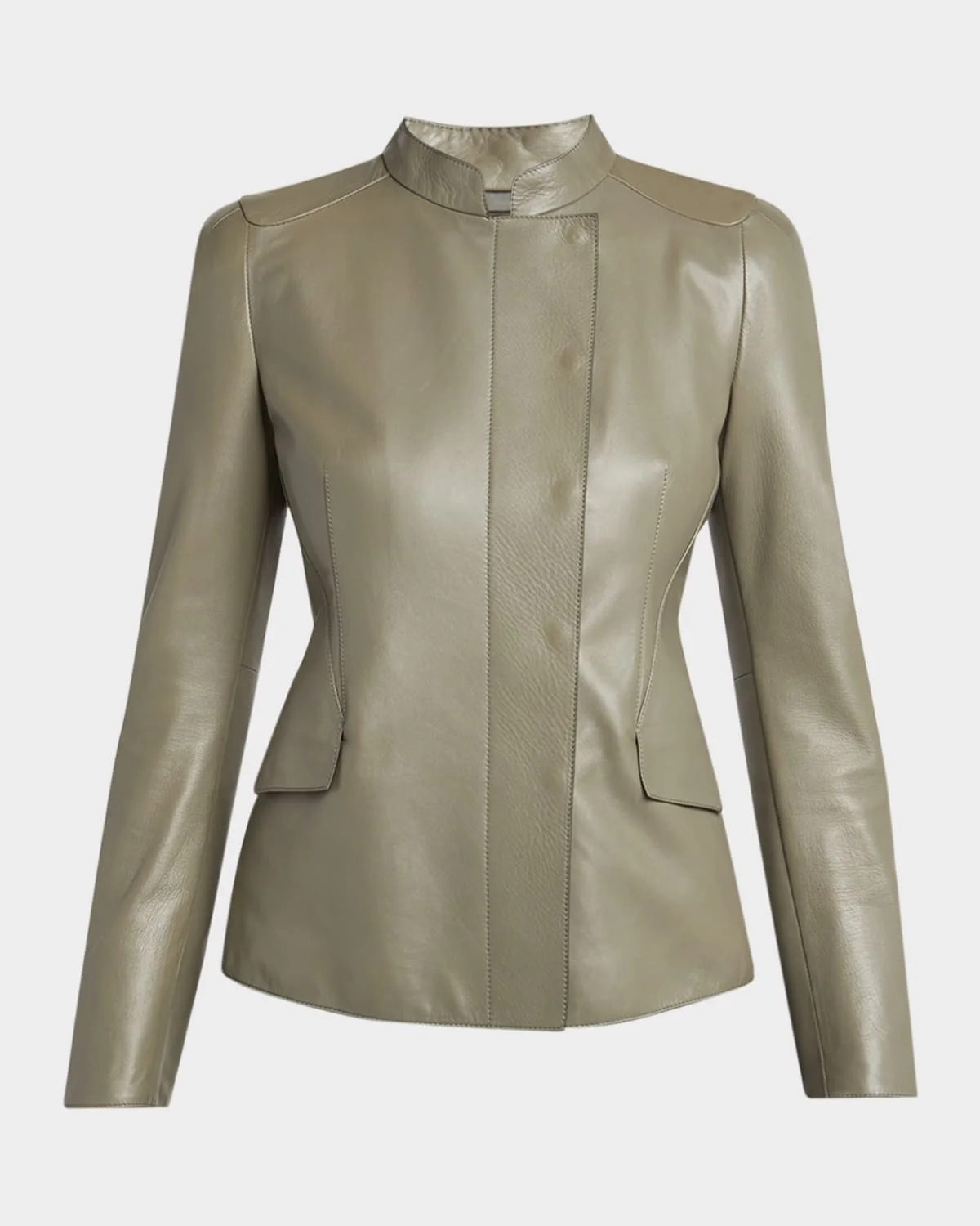 - Giorgio Armani jacket in smooth Nappa leather - Stand collar - Long sleeves with button cuffs - Tailored fit with defined waist - Hem sits at the hip - Concealed front closure - Leather - Leather method dry cleaning - Made in Italy