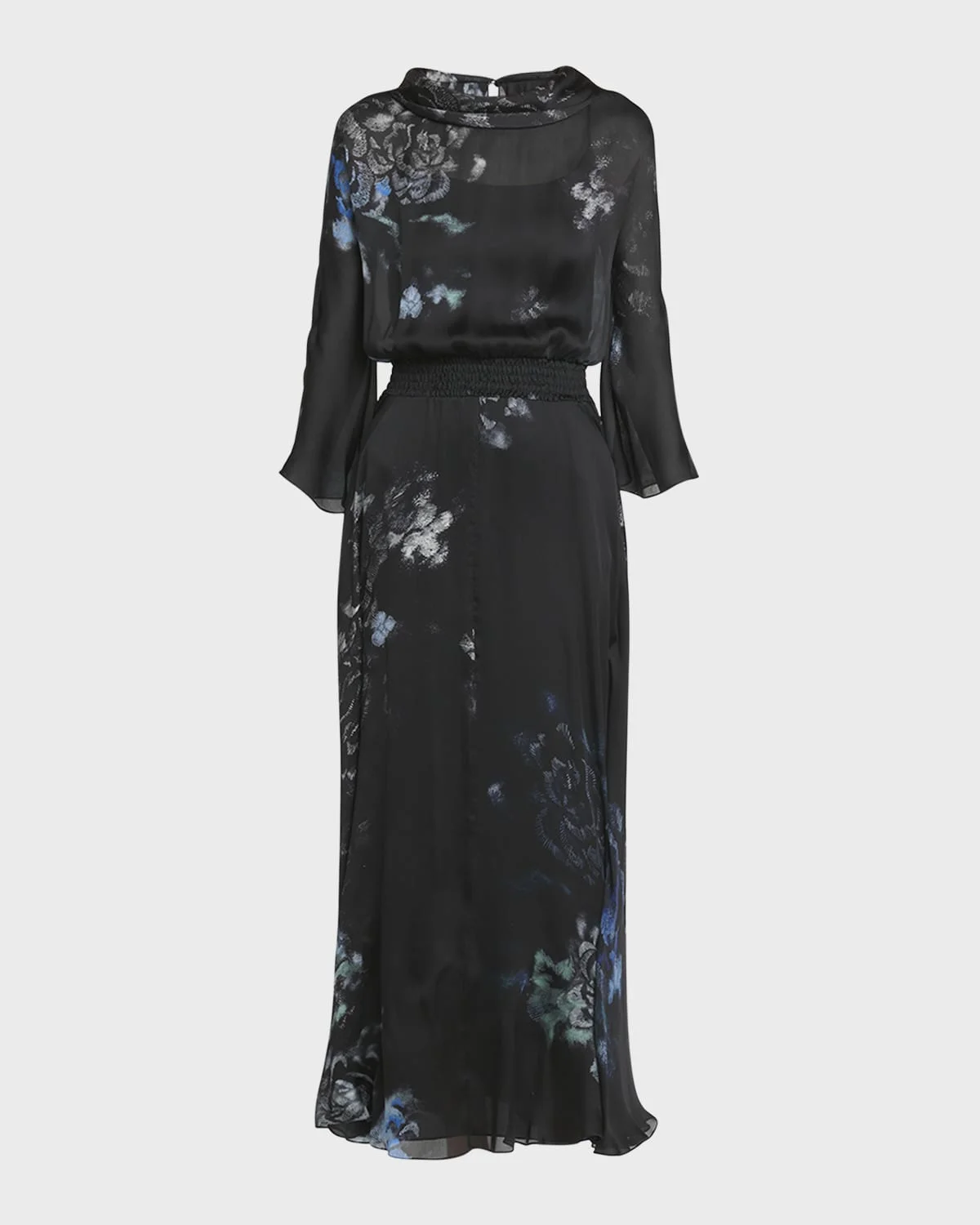 Giorgio Armani floral printed silk gown features a smocked waist detailing High neckline; keyhole back Long sleeves Full length Aline silhouette Silk Dry clean Made in Italy