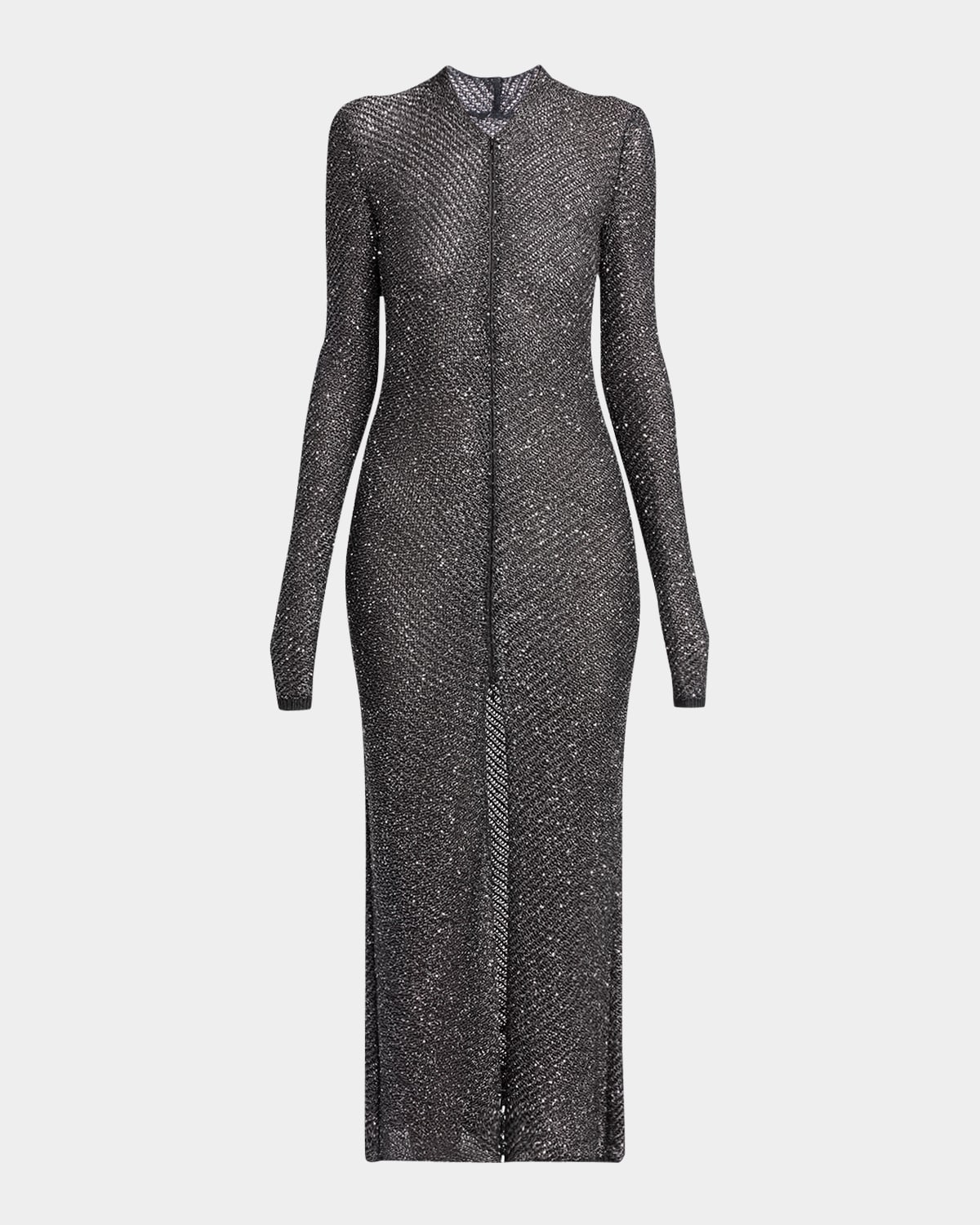 This Giorgio Armani sweater is crafted in a textured doublestitched knit, shimmering with metallic fibers, integrated sequins, and jeweled buttons V neckline Button front Long sleeves Center front slit Hem falls below the knee Straight silhouette Viscose/nylon/polyamide/metallic fibers Made in Italy