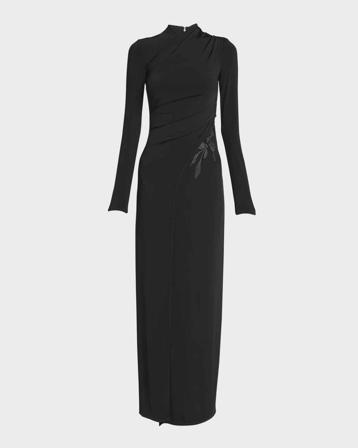 Giorgio Armani jersey gown features a beaded floral detailing at the hip High neckline Long sleeves Front center slit Full length Column silhouette Back zip closure Viscose Dry clean Made in Italy