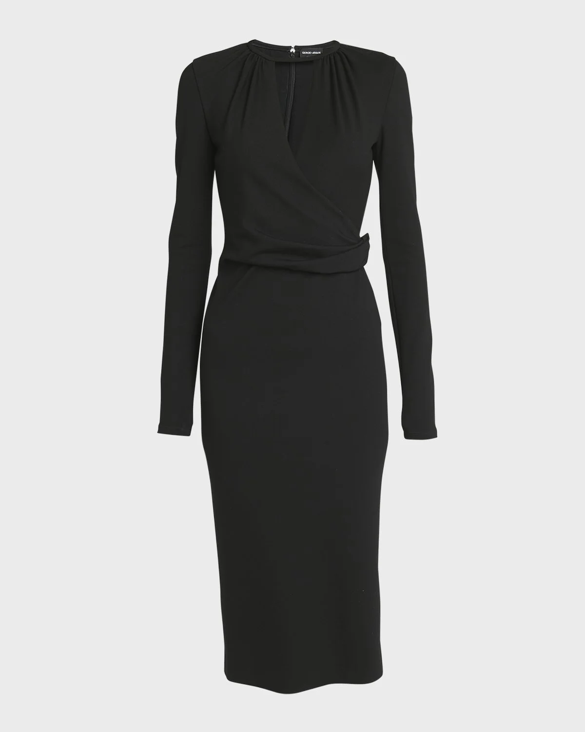 Giorgio Armani Milano jersey midi dress features a wrap front bodice with a keyhole cutout Round neckline Long sleeves Hem falls below the knee Back center slit Back zip closure Sheath silhouette Viscose/nylon/polyamide Dry clean Made in Italy