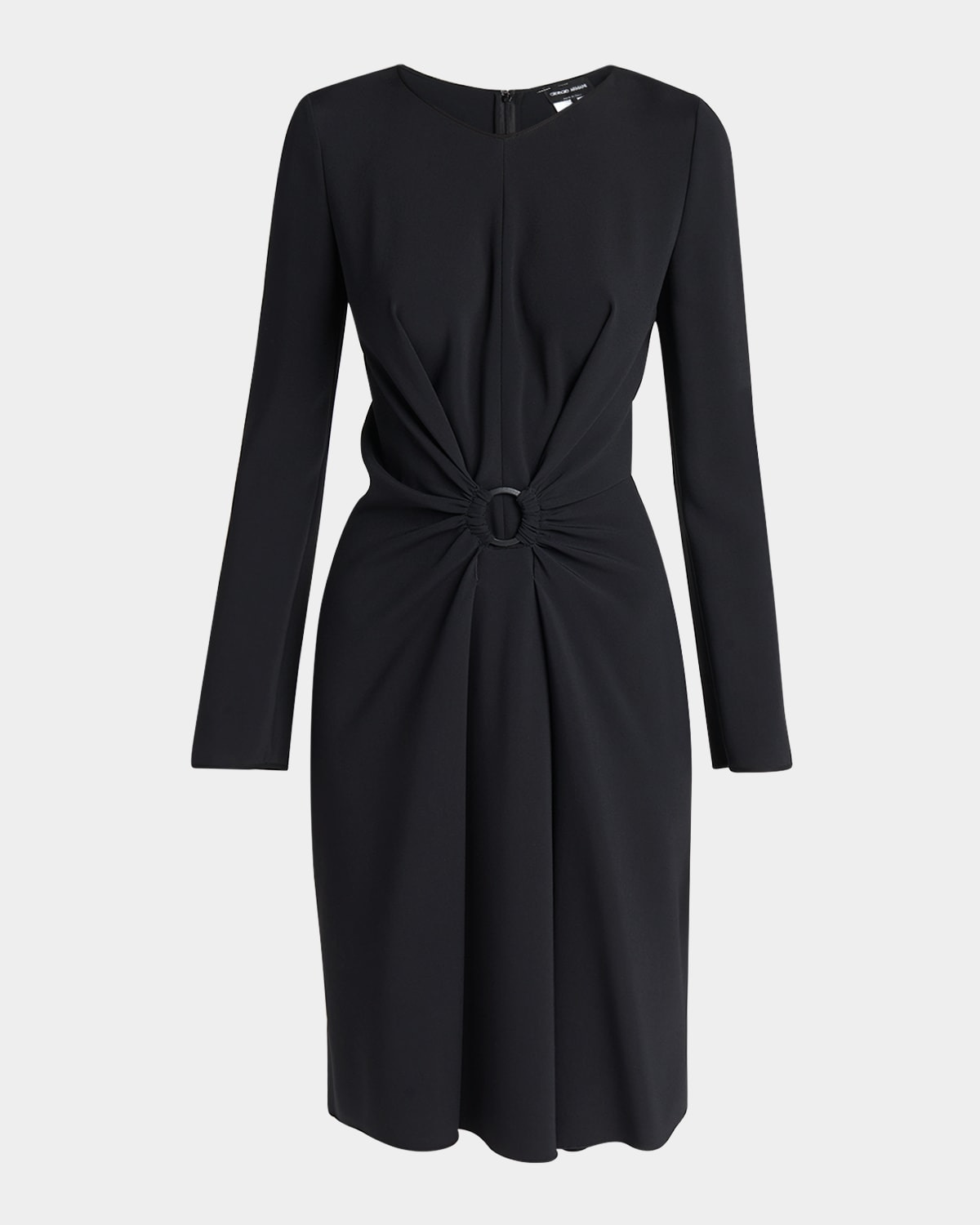 - Giorgio Armani viscose cady midi dress featuring a gathered front with ring detail - Crew neckline - Long sleeves - Sheath silhouette - Hem falls below the knee - Center back zip - Viscose/elastane - Dry clean - Made in Italy