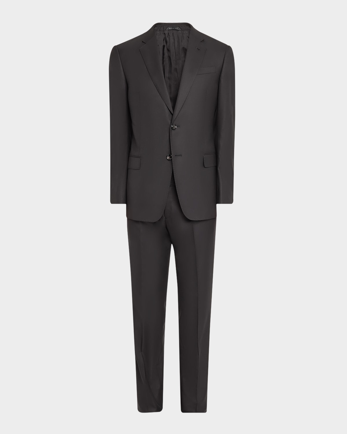 - Giorgio Armani basic two-piece suit in a virgin wool blend - Classic fit - Virgin wool/viscose - Partially lined - Made in Italy - Jacket: - Notched lapels - Buttonhole at left lapel - Two-button front - Chest welt pocket - Hip flap pockets - Unfinished sleeves - Double-vented back - Trousers: - Regular rise - Flat front - Full length - Unfinished hem to be tailored to desired length - Model is 6'1"/185cm.