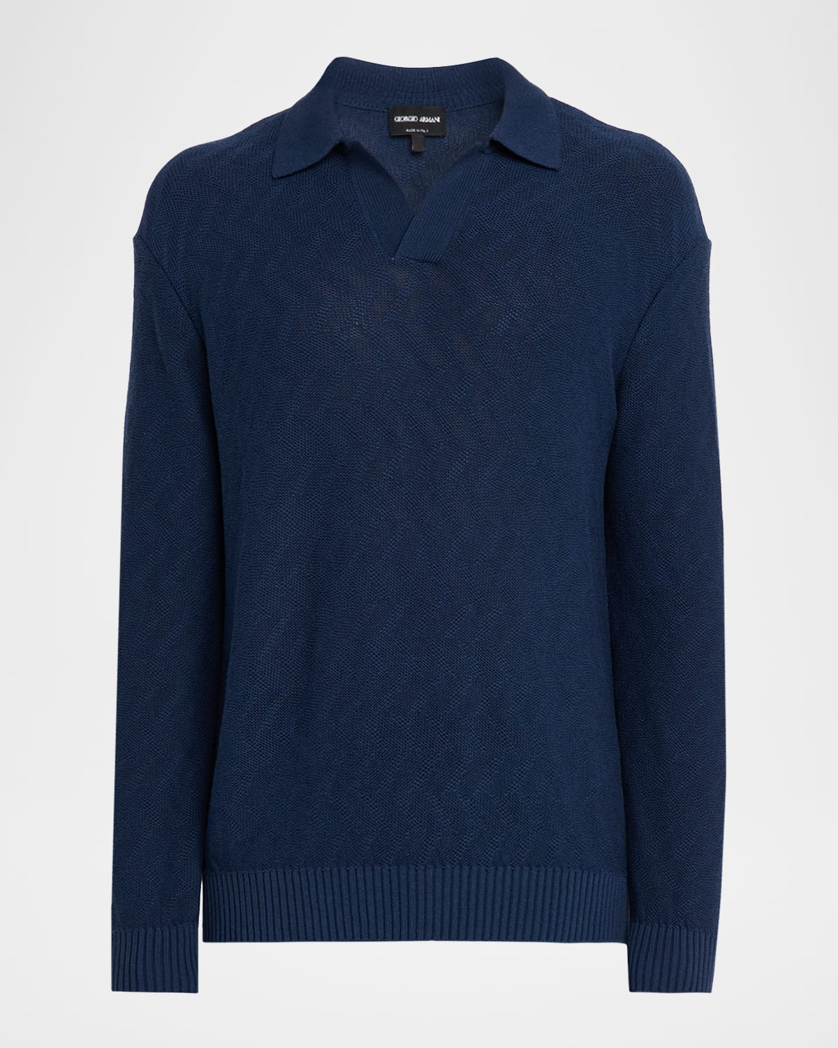 - Giorgio Armani sweater in chevron stitched cotton resulting in a unique texture - Johnny collar - Long sleeves - Ribbed cuffs and hem - Pullover style - Cotton - Dry clean - Made in Italy