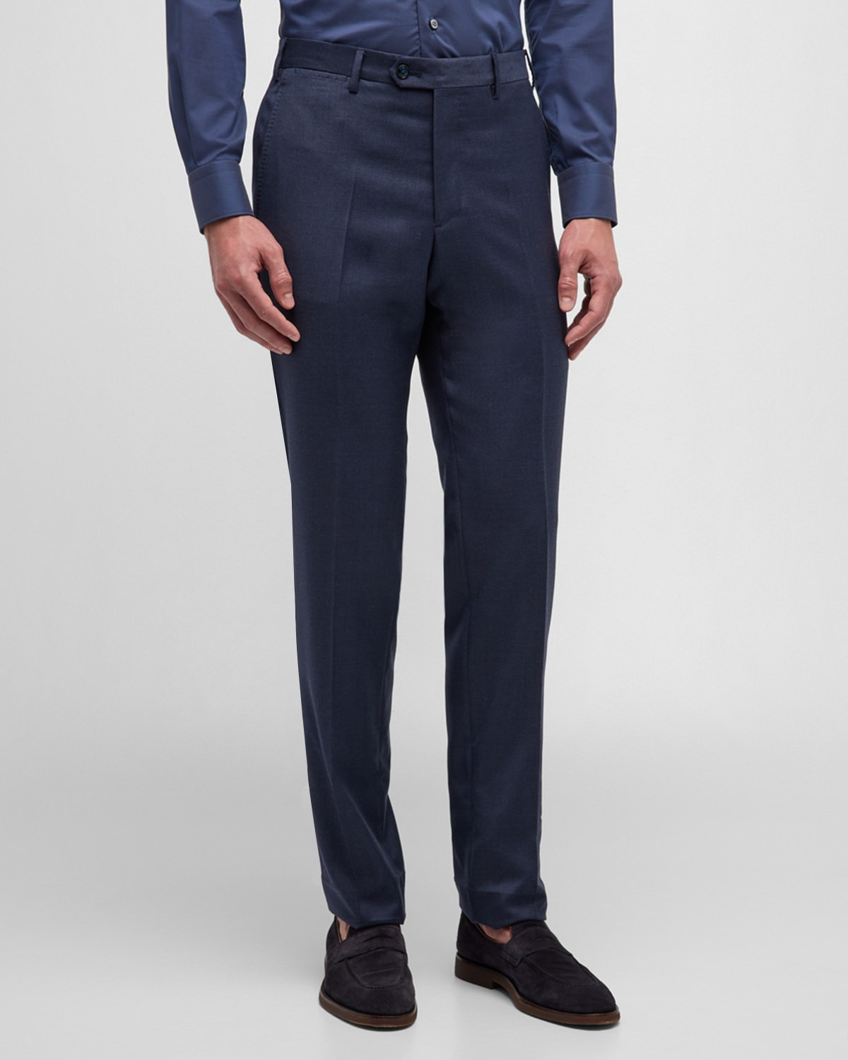 - Giorgio Armani trousers crafted of fine virgin wool - Regular rise - Flat front - Zip fly with extended button closure - Side slip pockets - Buttoned back pockets - Full length - Straight legs - Dry clean - Made in Italy - Model is 6'1"/185cm.