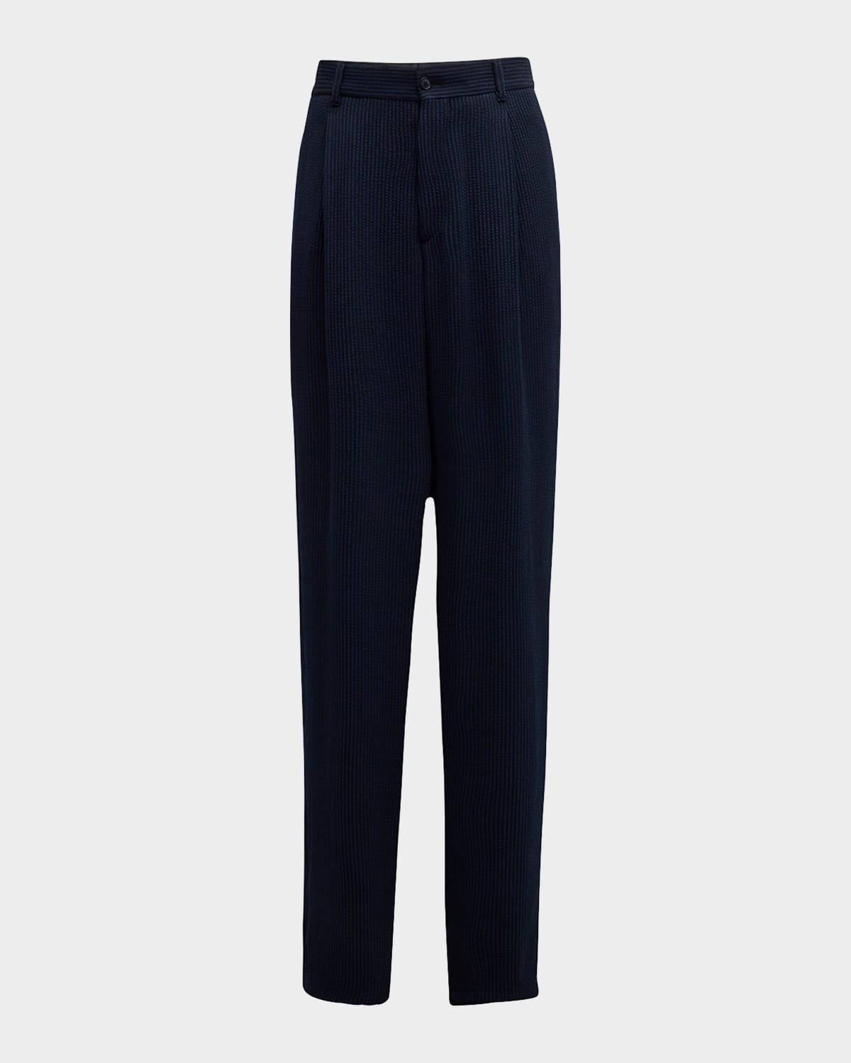 - Giorgio Armani pants in solid seersucker - Mid rise - Button/zip closure - Pleated front - Side slip pockets - Back welt pocket - Full length - Loose fit through straight legs - Viscose/acetate - Lining: Acetate/cupro - Dry clean - Made in Italy - Model is 6'1"/185cm.