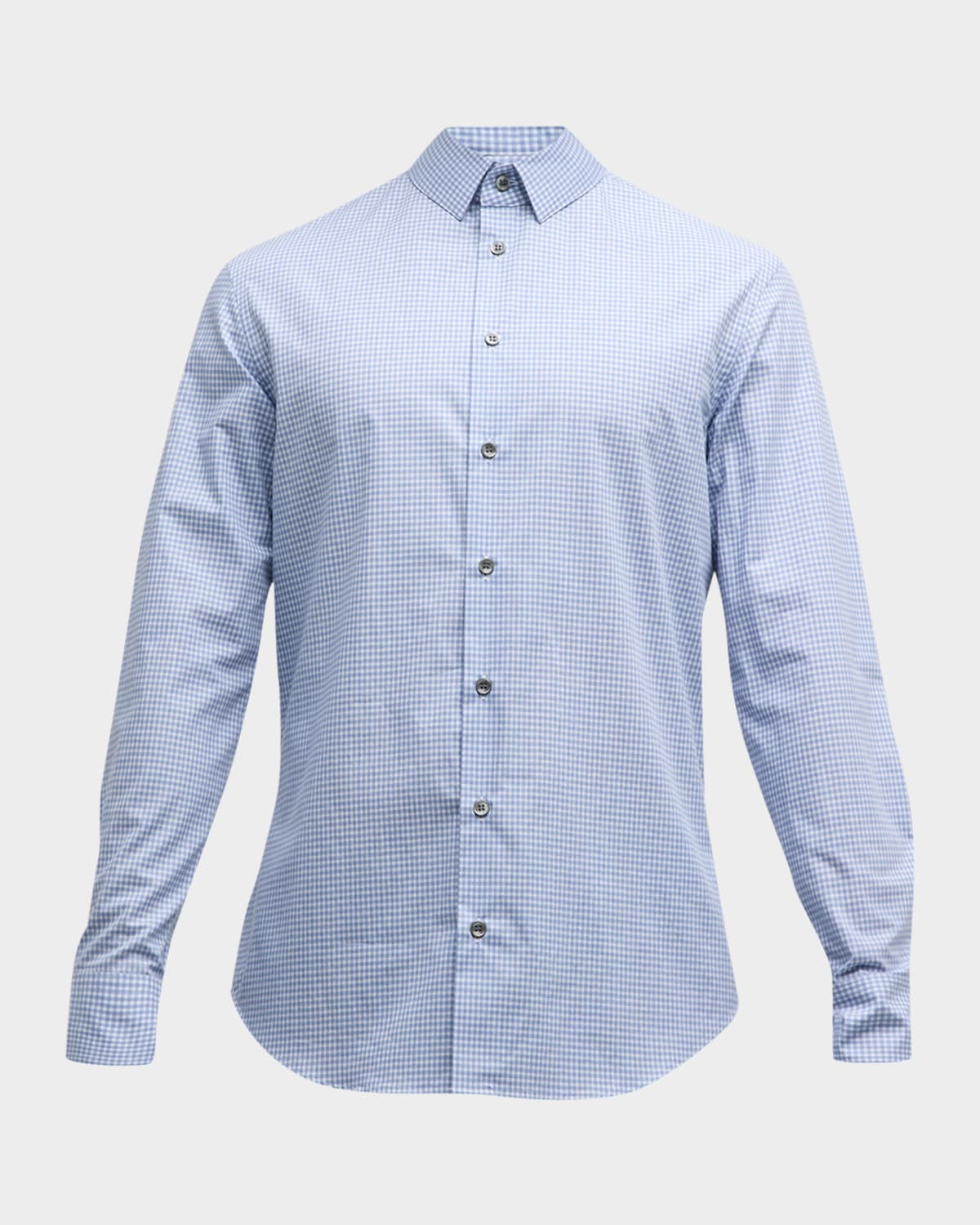 - Giorgio Armani sport shirt in micro-box pattern - High spread collar - Button placket - Long sleeves - Curved hemline - Cotton - Dry clean - Made in Italy - Model is 6'1"/185cm.