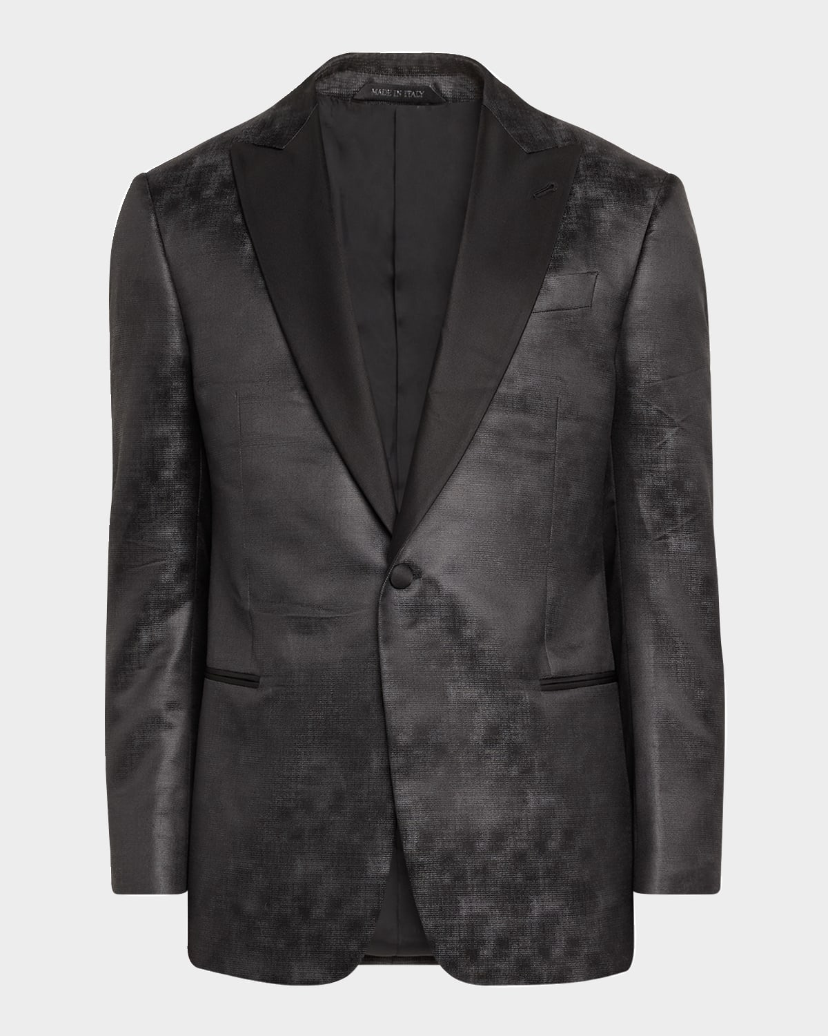 - Giorgio Armani dinner jacket in micro dot weave with washed effect - Peak lapels - Single-button closure - Chest welt pocket - Side besom pockets - Unfinished sleeves - Double-vented back - Wool/silk - Made in Italy - Model is 6'1"/185cm.