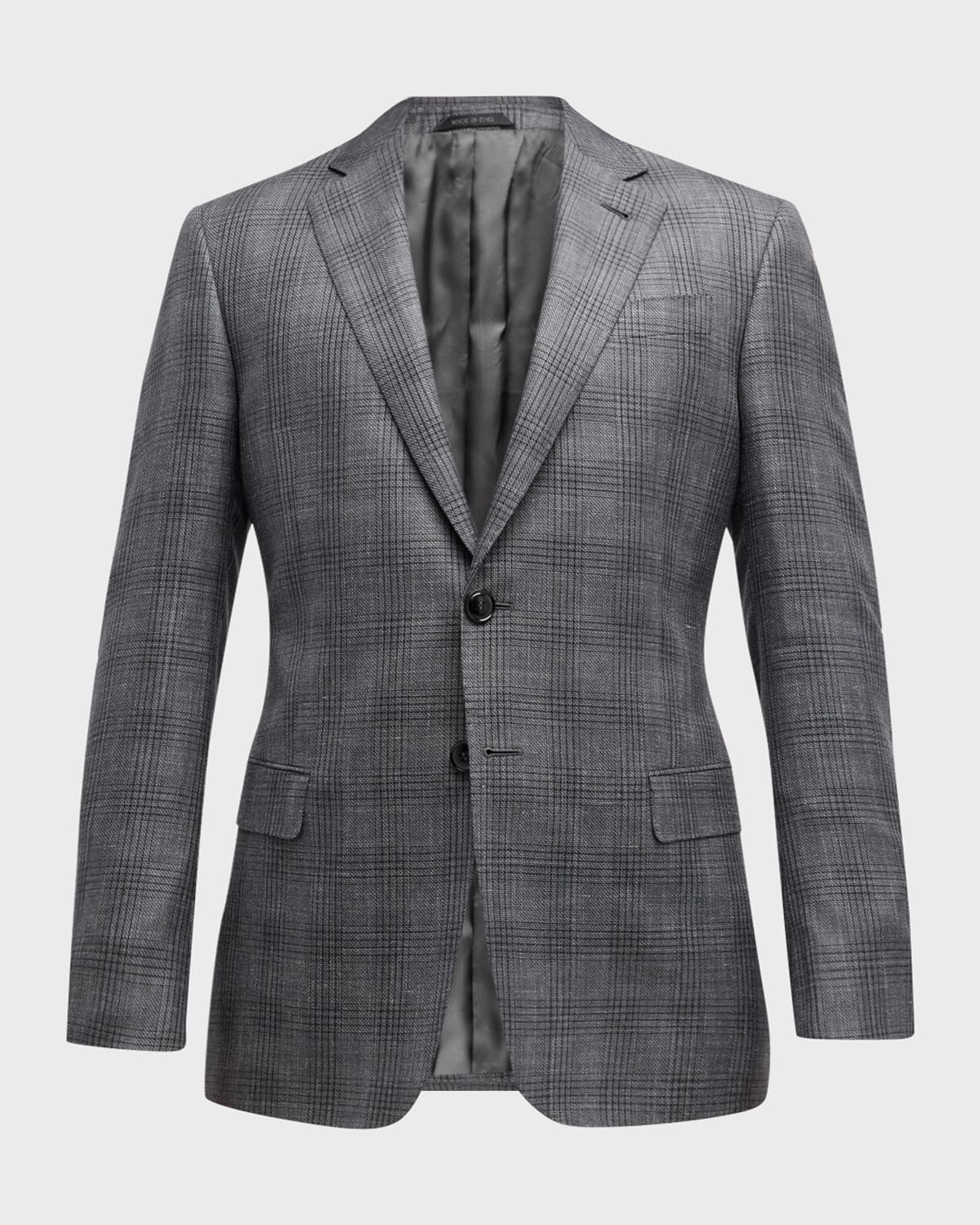 - Giorgio Armani blazer featuring a plaid windowpane motif in a wool-silk blend - Notched lapels; two-button front - Basted sleeves - Chest welt pocket; side flap pockets - Double-vented back - Virgin wool/silk/linen - Lining: Viscose - Dry clean - Made in Italy - Model is 6'1"/185cm.