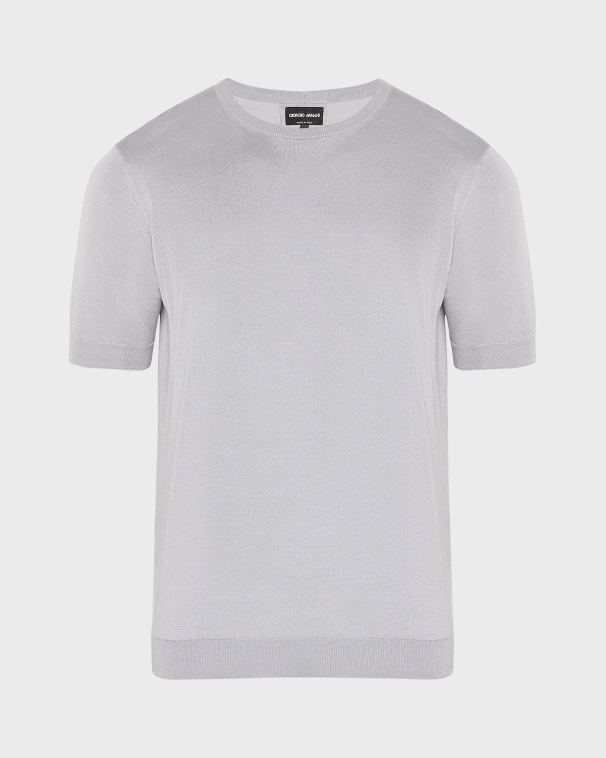 - Giorgio Armani solid T-shirt in luxurious silk-cotton blend - Crew neckline - Short sleeves - Finely ribbed cuffs and waistband - Pullover style - Dry clean - Made in Italy - Model is 6'1"/185cm.