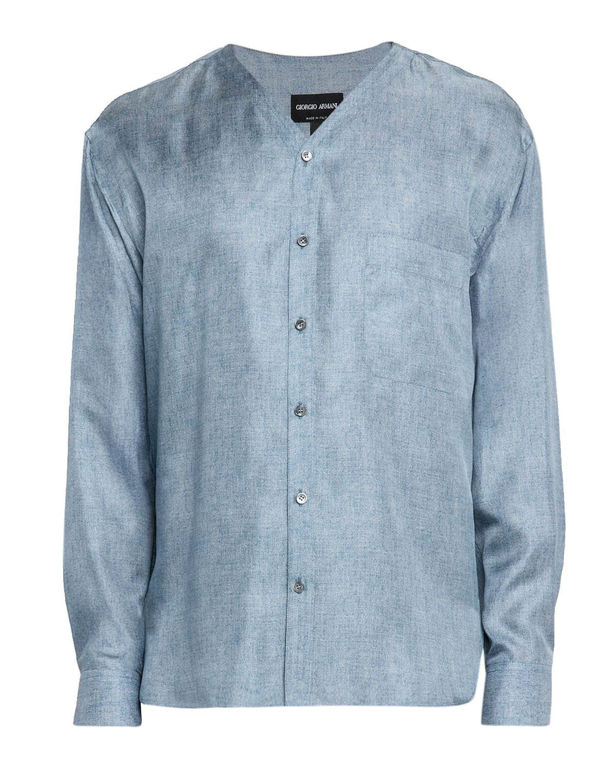 - Giorgio Armani button-down shirt in lustrous silk showcasing a denim effect - V neckline - Button placket - Chest pocket - Long sleeves - Pleated back yoke - Single-button cuffs - Curved hem - Silk - Dry clean - Made in Italy