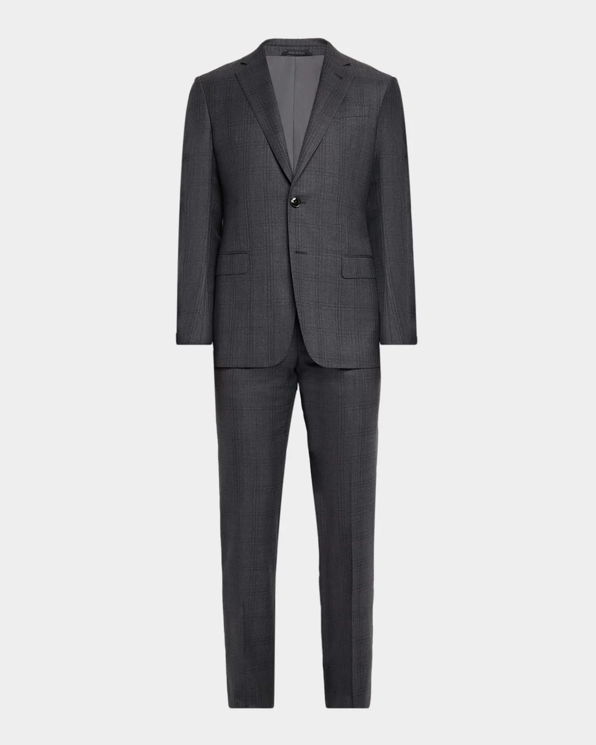 - Giorgio Armani two-piece suit is cut from a lightweight wool blend in a subtle tonal check pattern for added subtle depth - Virgin wool/viscose - Dry clean - Made in Italy - Jacket: - Notched lapels - Chest welt pocket - Single-breasted front - Hip flap pockets - Long sleeves - Double-vented back - Trousers: - Regular rise - Flat front - Side slip pockets - Classic fit through straight legs - Extended button-zip front - Unfinished hem to be tailored to desired length