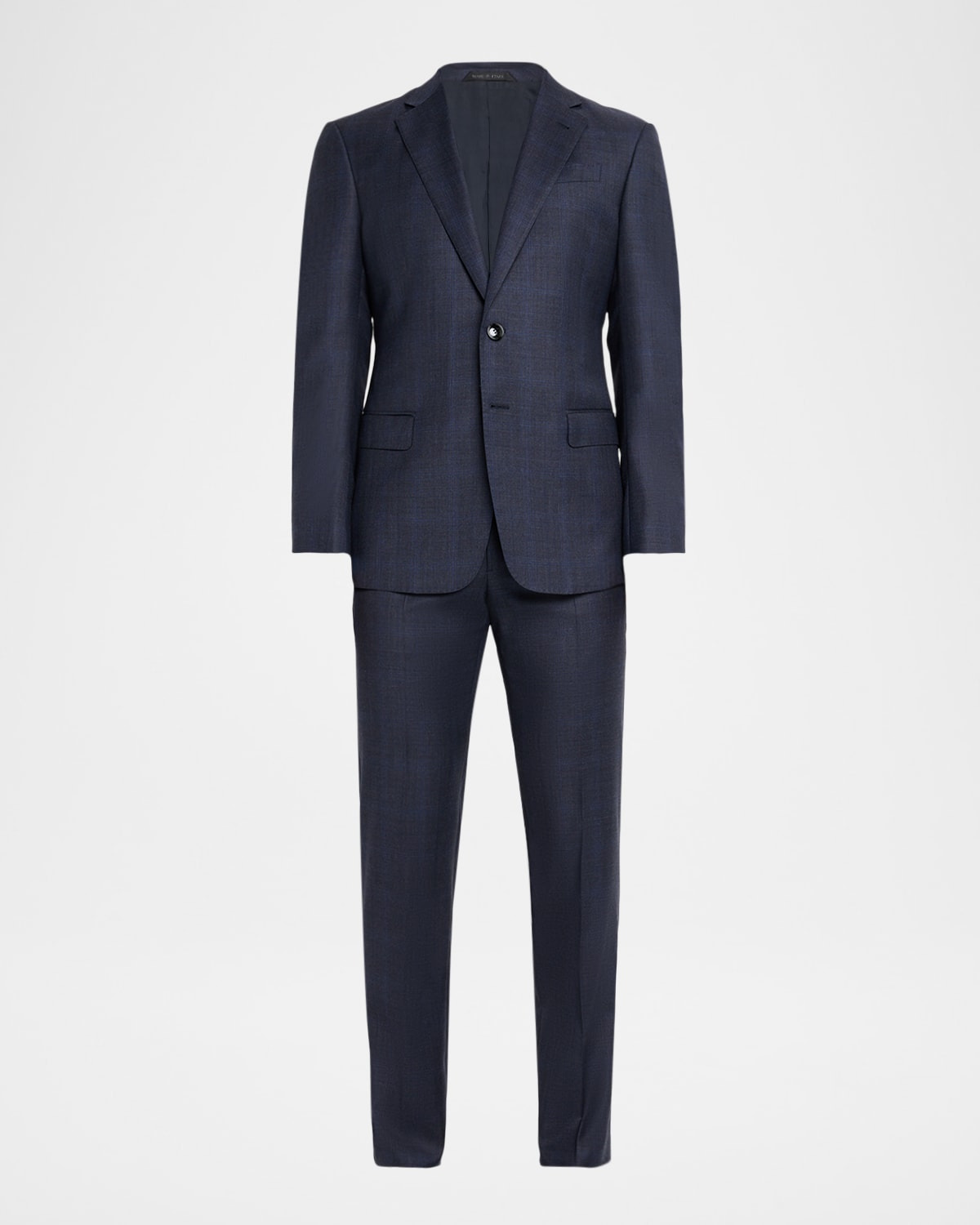 - Giorgio Armani two-piece suit is cut from a lightweight wool blend in a subtle windowpane pattern for added subtle depth - Virgin wool/viscose/silk - Dry clean - Made in Italy - Jacket: - Notched lapels - Chest welt pocket - Single-breasted front - Hip flap pockets - Long sleeves - Double-vented back - Trousers: - Regular rise - Flat front - Side slip pockets - Classic fit through straight legs - Extended button-zip front - Unfinished hem to be tailored to desired length