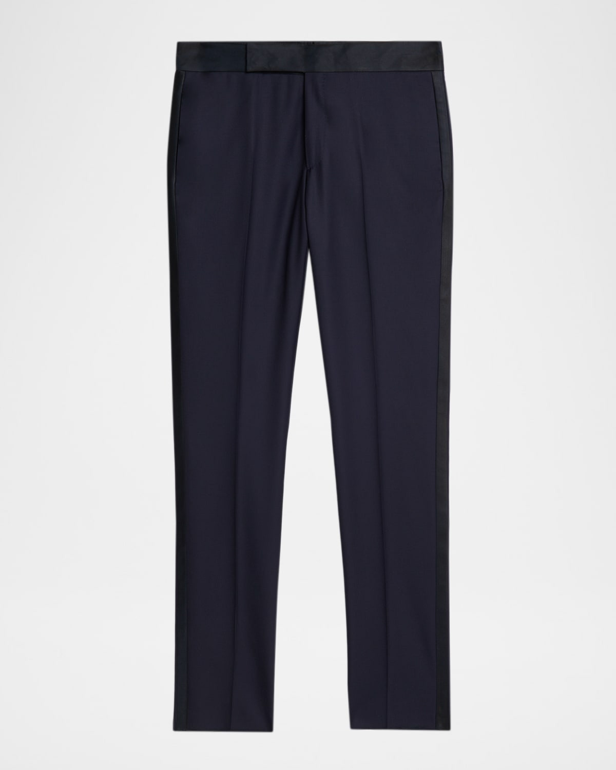 - Giorgio Armani formal trousers in wool highlighted with lustrous satin trim - Regular rise - Flat front - Side slip pockets - Buttoned back besom pockets - Modern fit through straight legs - Full length - Extended button-zip front - Virgin wool/polyester - Dry clean - Made in Italy