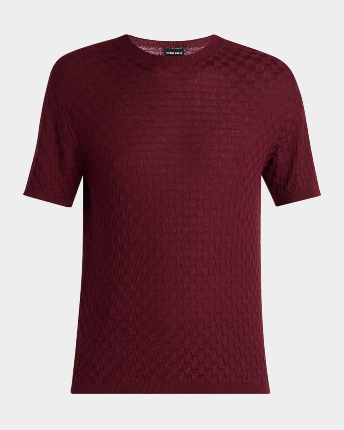 - Giorgio Armani sweater knit from sumptuous cashmere and silk, showcasing a woven quadrant pattern - Crew neckline - Short sleeves - Ribbed cuffs and hem - Pullover style - Cashmere/silk - Dry clean - Made in Italy