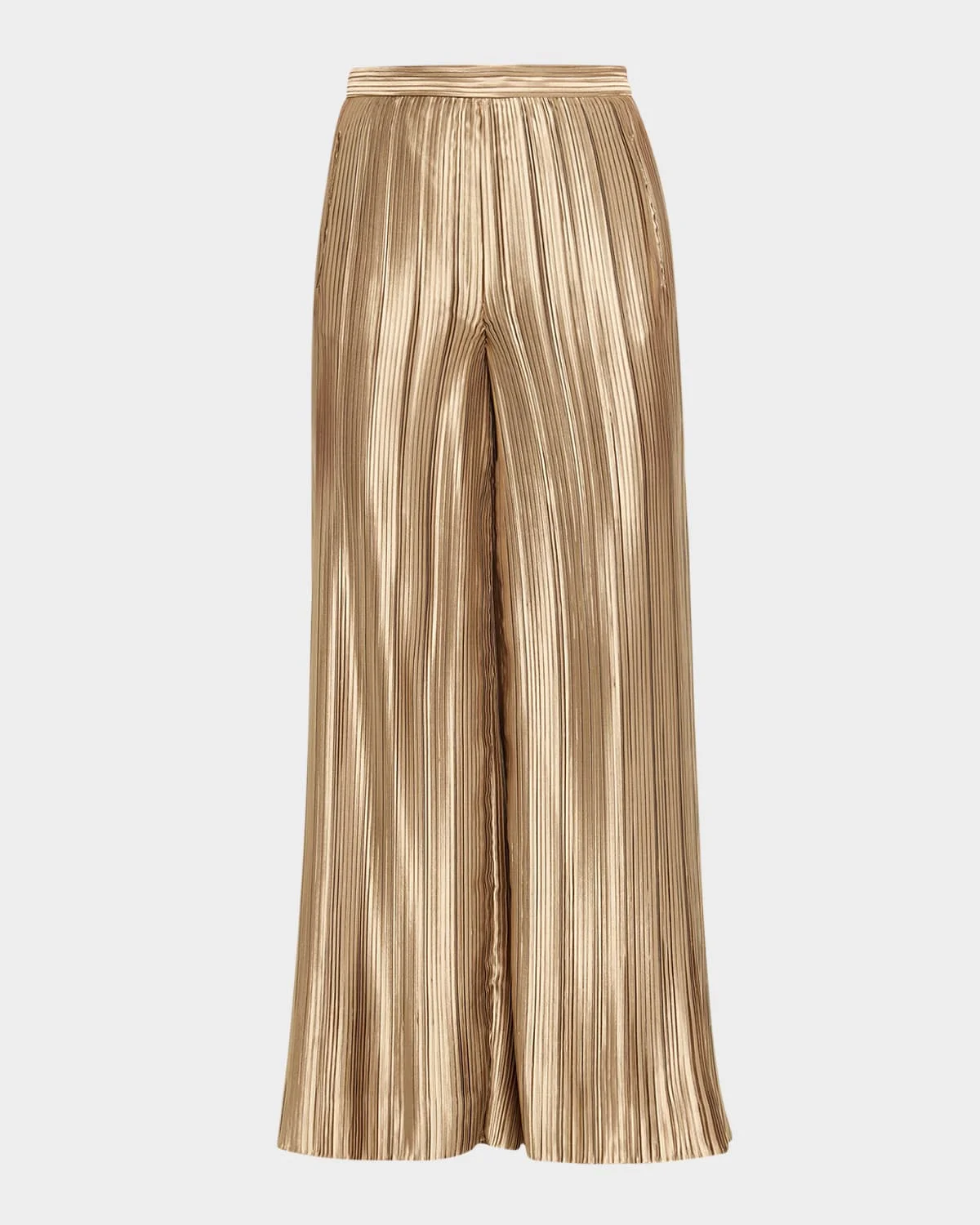 These pants from & nbsp;Giorgio Armani are crafted from metallic plisse satin & nbsp;that gives unique & nbsp;three-dimensionality Mid rise sits high on hip Side slip pockets Wide legs Full length Invisible back zip Polyester Made in Italy SIZE & FITModel measurements: 5 & apos;10" tallModel is wearing a US size 4/Small