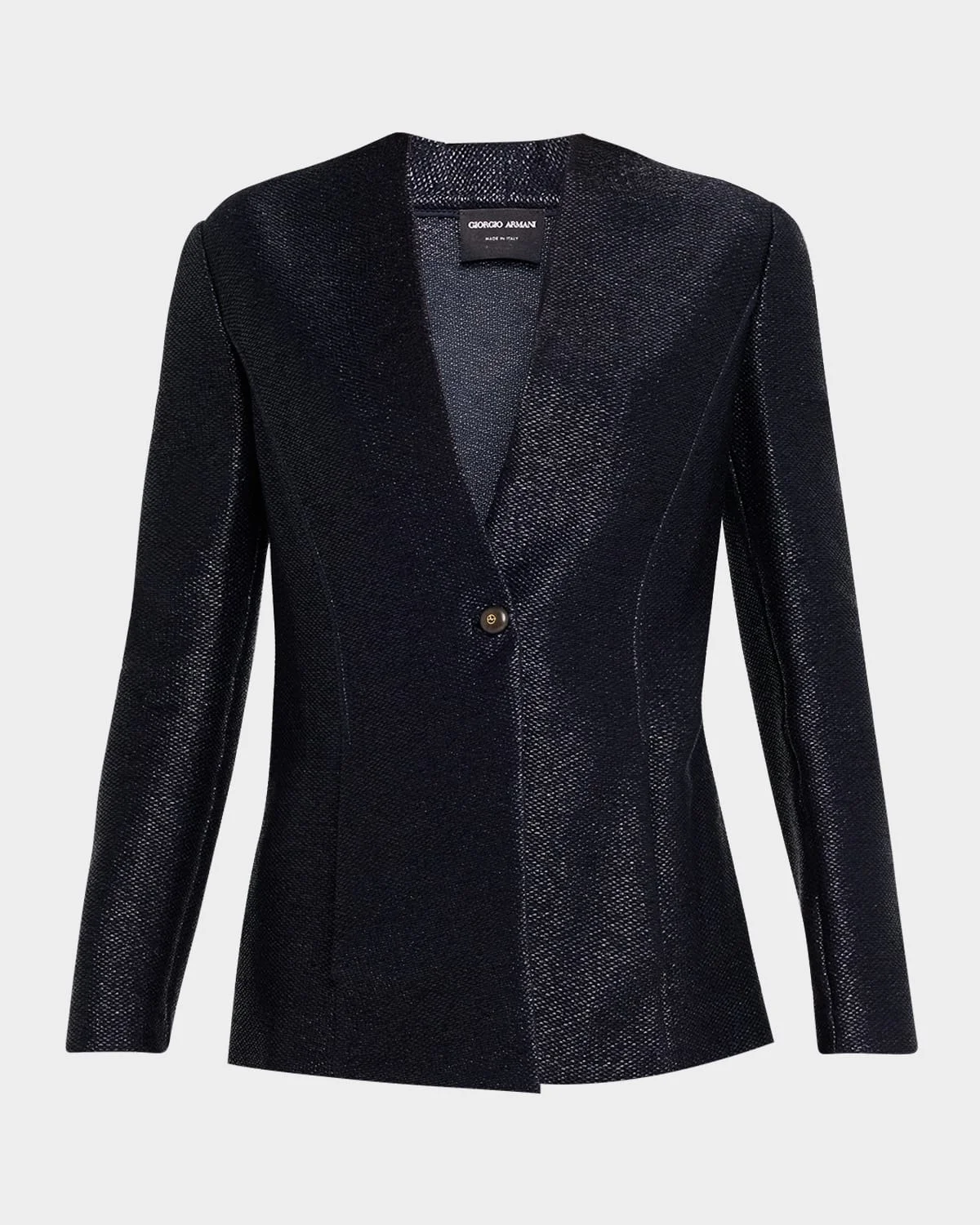 This collarless jacket from Giorgio Armani is crafted from shimmering & nbsp;metallic raffia and fastened with a monogram novelty button V neckline; single-breasted front Long sleeves Padded shoulders Side seam pockets Slim fit Hem falls below the hip Walking vent back Button closure Cotton/raffia Dry clean Made in Italy SIZE & FITModel measurements: 5 & apos;10" tallModel is wearing a US size 4/Small