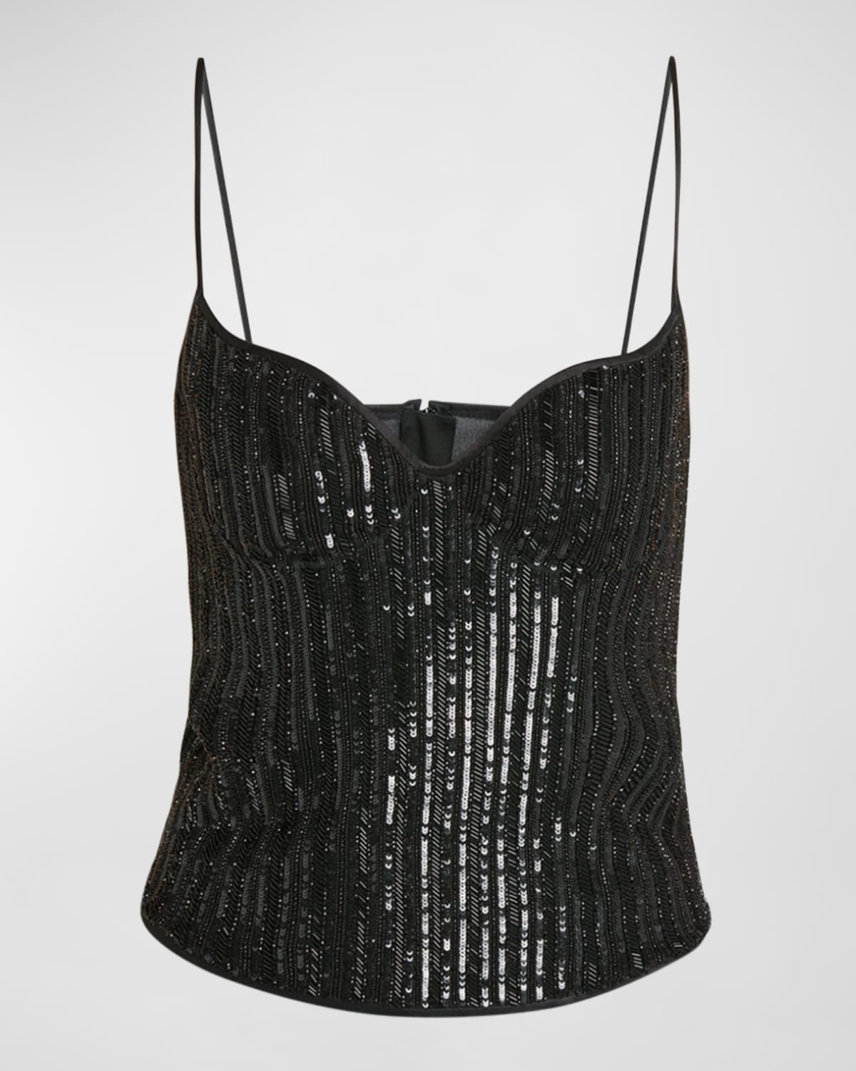 Giorgio Armani bustier top features micro baguette and sequined detailing all over Sweetheart neckline Sleeveless Hip length Fitted Back zip closure Silk Dry clean Made in Italy