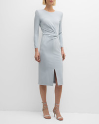 Giorgio Armani Milano jersey dress features a pleated waist gathering at the front Round neckline Long sleeves Front center slit Hem falls at the knee Sheath silhouette Concealed back zip Viscose Dry clean Made in Italy