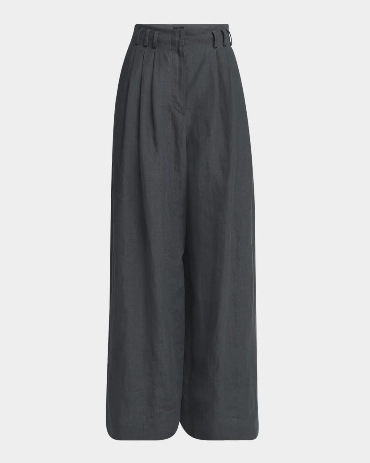 Giorgio Armani trousers featuring a triple pleated front Mid rise sits high on hip Side slip pockets Wide legs Full length Hook/zip fly; belt loops Linen Dry clean Made in Italy