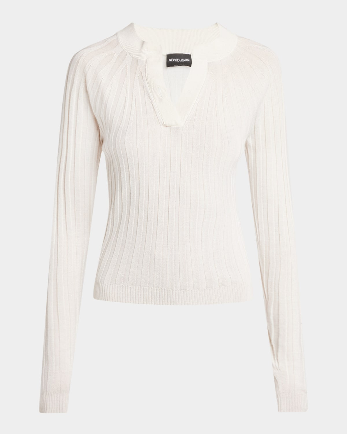 - Giorgio Armani ribbed knit top - V neckline - Button closure - Long sleeves - Slim fit - Pullover style - Cashmere/silk - Dry clean - Made in Italy