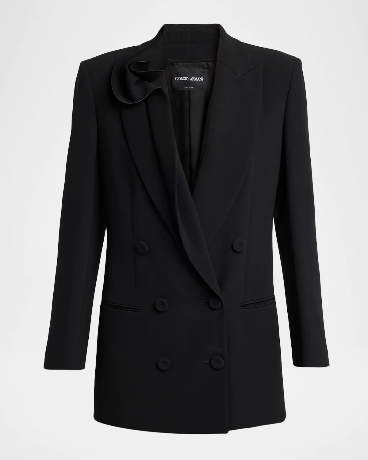 Giorgio Armani blazer jacket is crafted from silk crepe accented with a rosette-like draped & nbsp;lapel and self-covered buttons Peak collar; double-breasted front Long sleeves; button cuffs Padded shoulders Hip welt pockets Straight fit Hem falls below the hip Button closure Silk Dry clean Made in Italy