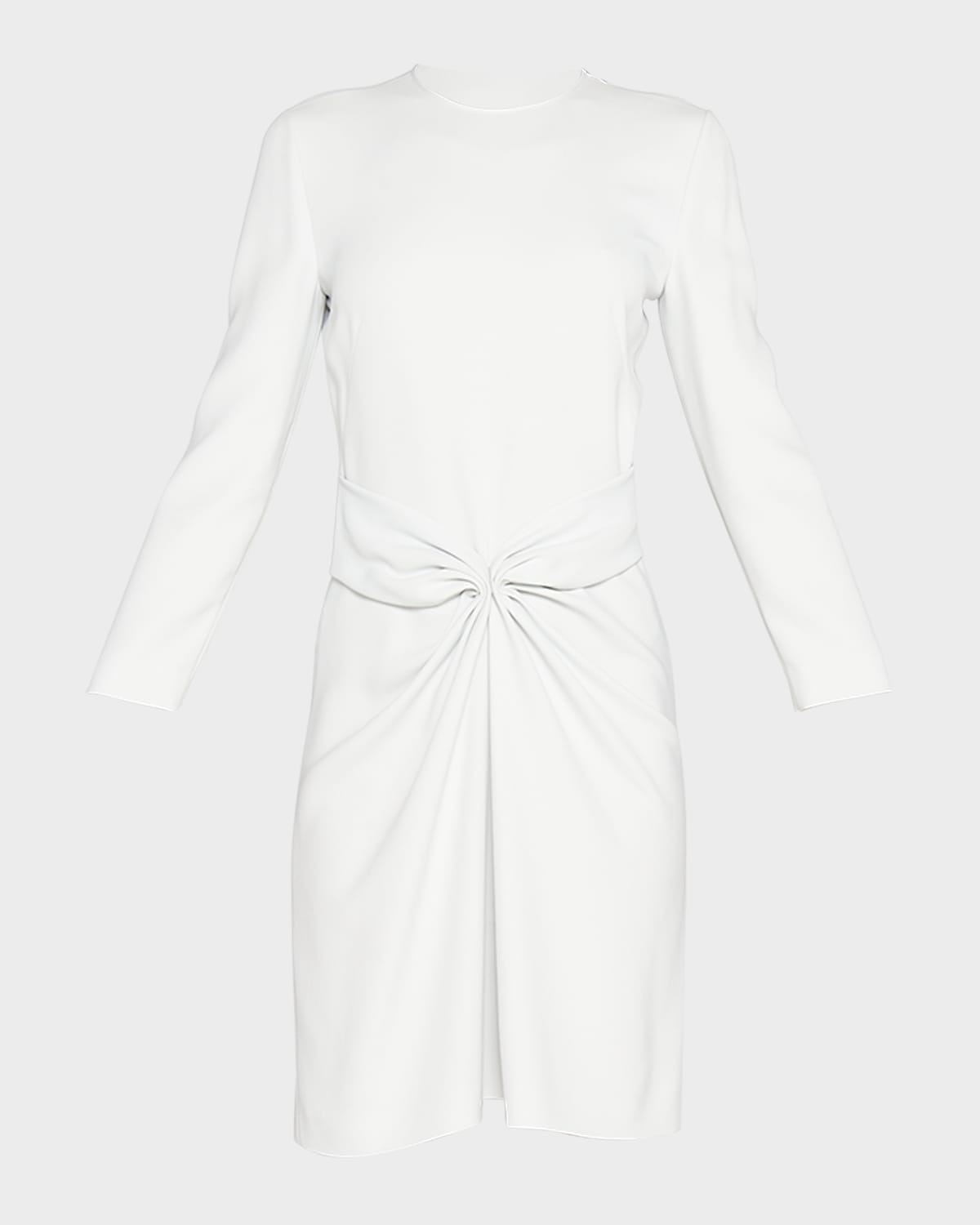Giorgio Armani dress featuring a ruched waist detail Round neckline Long sleeves Aline silhouette Knee length Invisible back zip Viscose/silk Dry clean Made in Italy