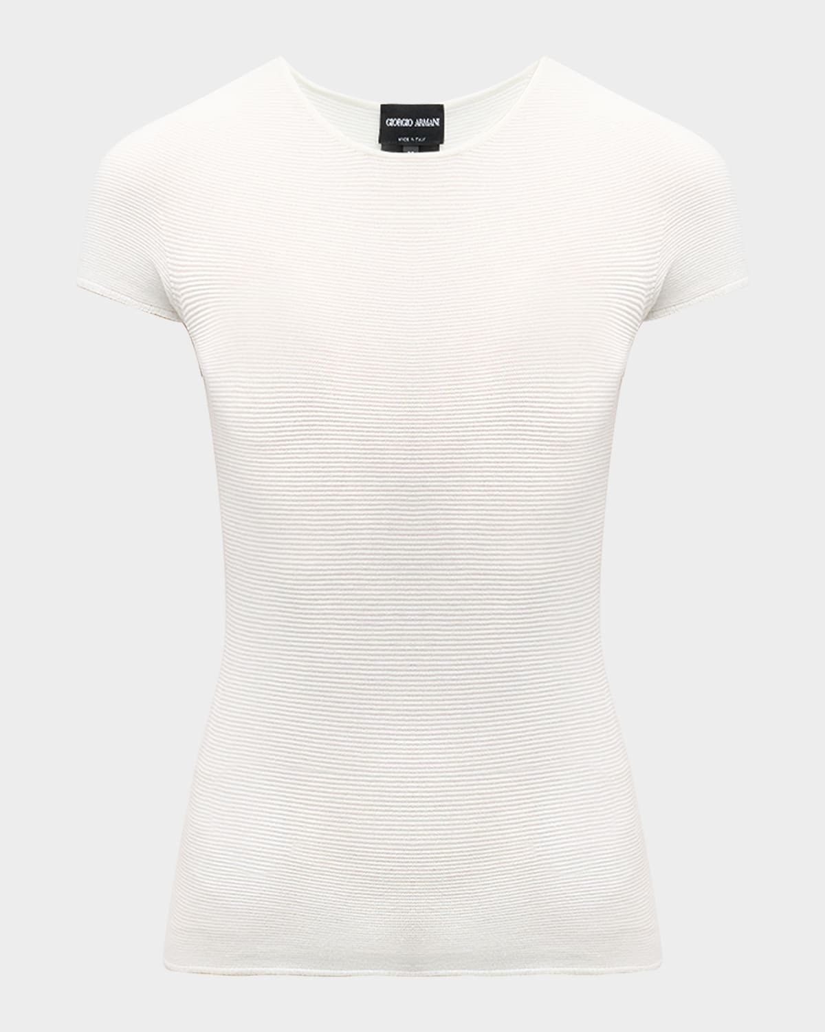 Giorgio Armani solid ribknit tee. Scoop neckline. Short sleeves. Fitted. Straight hem. Pullover style. Viscose/polyester. Made in Italy. Size Note: Height: 5'10"/ waist 24"/ hips 36"/ bust 34" Model is wearing size 38IT