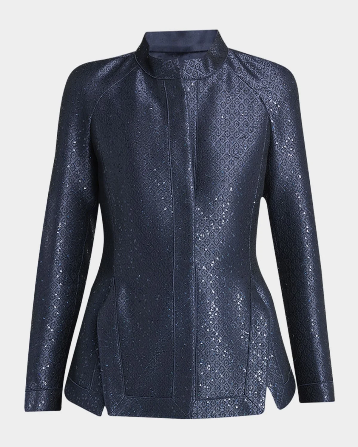- Giorgio Armani evening jacket in sequin jacquard with front hip slits - Band collar; single-breasted front - Long sleeves; unfinished cuffs - Slim fit - Hip length - Concealed button closure - Polyester/viscose - Dry clean - Made in Italy