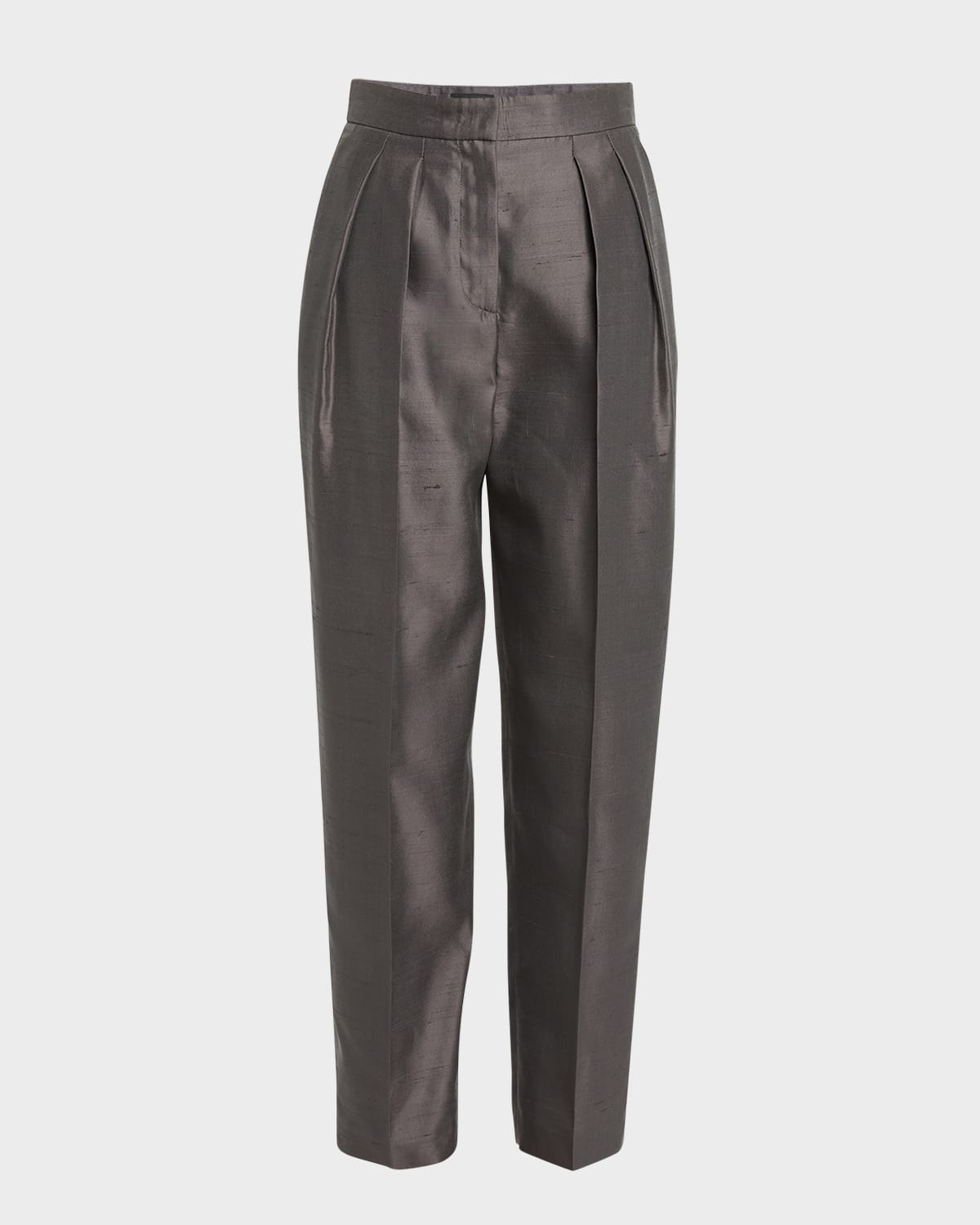 Giorgio Armani trousers in shantung silk High rise Doublepleated front Side slip pockets; back welt pockets Straight legs Full length Hook/zip fly Silk Dry clean Made in Italy