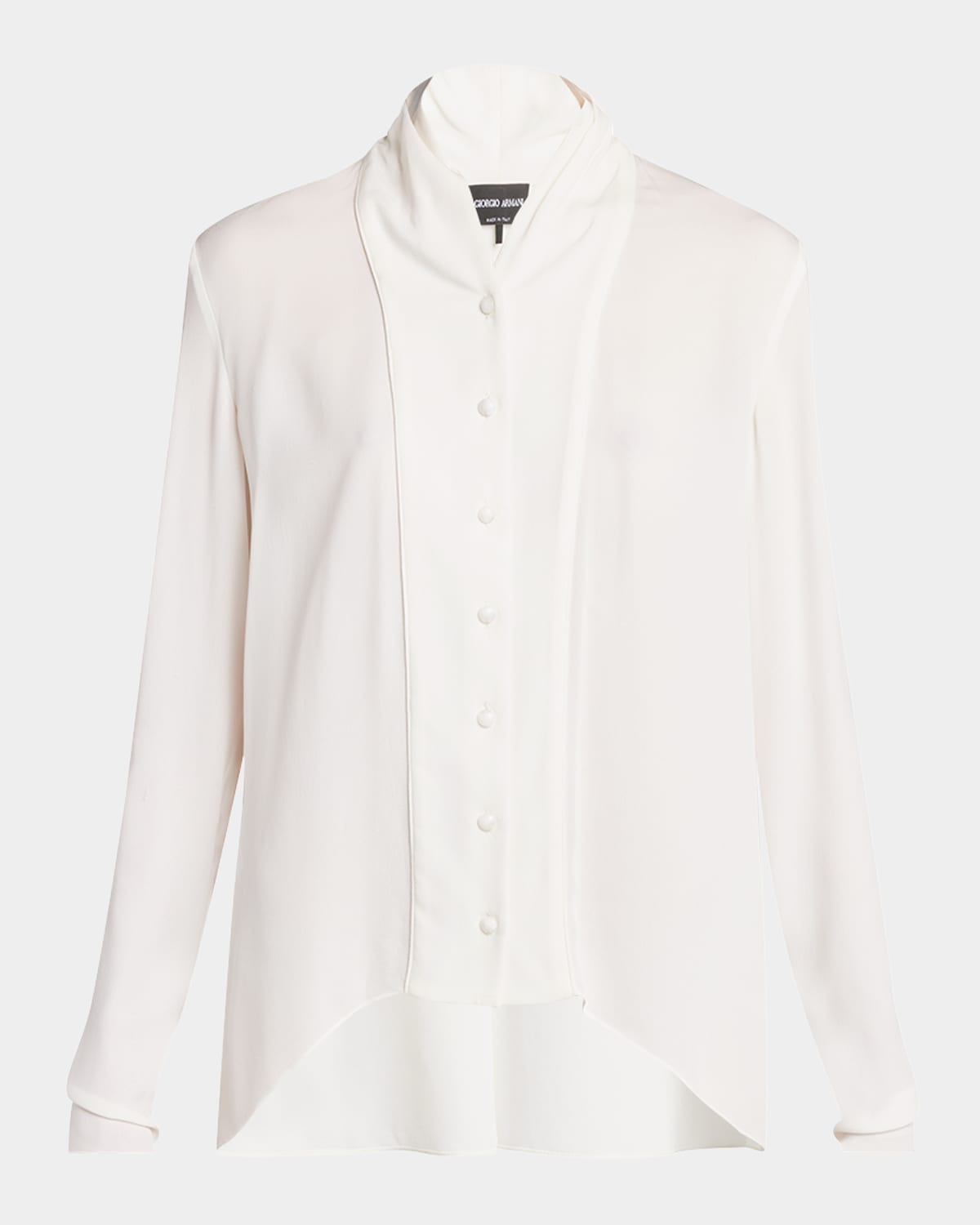 - Giorgio Armani silk georgette blouse featuring a large front placket detail and back pleat - Shawl collar; button front - Long sleeves - Relaxed fit - High-low hem - Silk - Dry clean - Made in Italy
