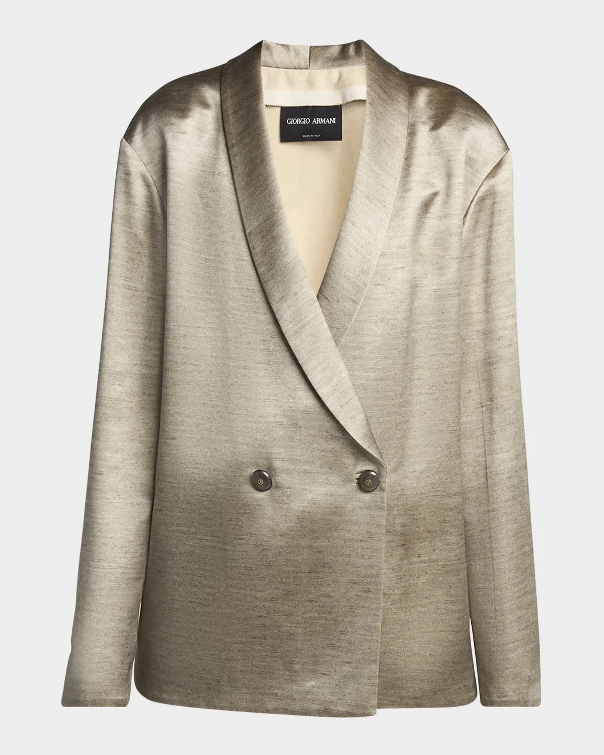 Giorgio Armani blazer jacket is crafted from lustrous silk satin accented with pearly logo buttons Shawl lapels; double-breasted front Long sleeves Straight fit Hem falls below the hip Silk Dry clean Made in Italy