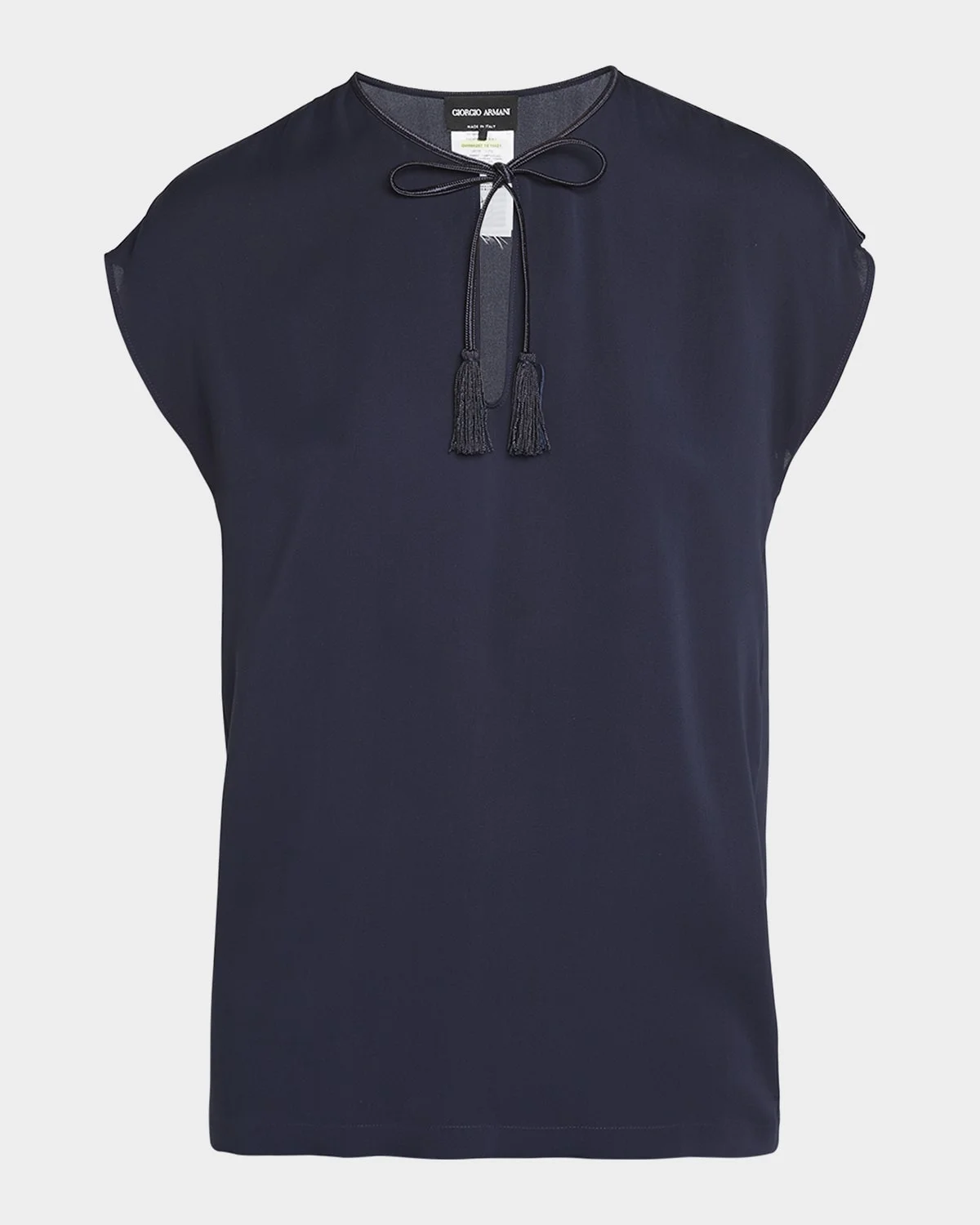 Giorgio Armani silk georgette blouse features a tie neckline with fringe tassels V-neckline Sleeveless Hip length & nbsp; Relaxed fit & nbsp; Silk Dry clean Made in Italy Model is 5 & apos;10"/177cm.