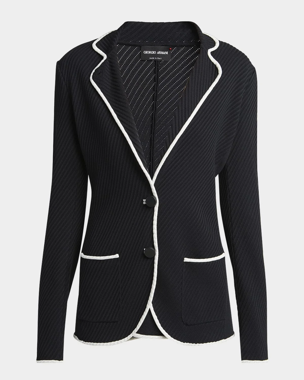 - Giorgio Armani jacket in diagonal silk pointelle knit with contrast piping - Notch lapels; single-breasted front - Long sleeves - Padded shoulders - Hip welt pockets - Slim fit - Button closure - Silk/nylon/polyamide/elastane - Dry clean - Made in Italy