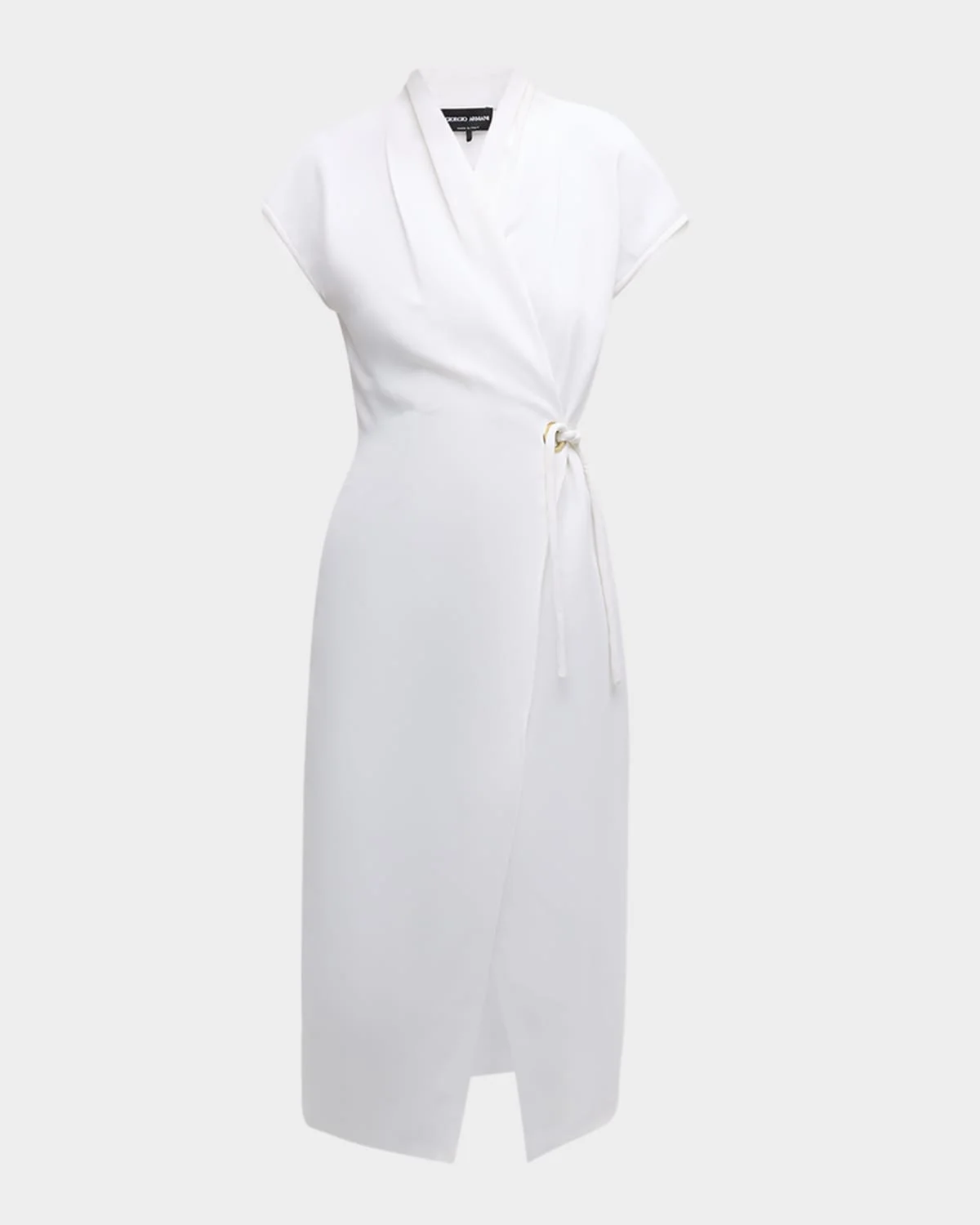 Giorgio Armani silk wrap midi dress features selftie closure at the hip with goldtone detail Vneckline Short sleeves Hem hits around the knee Aline silhouette Viscose/elastane Dry clean Made in Italy