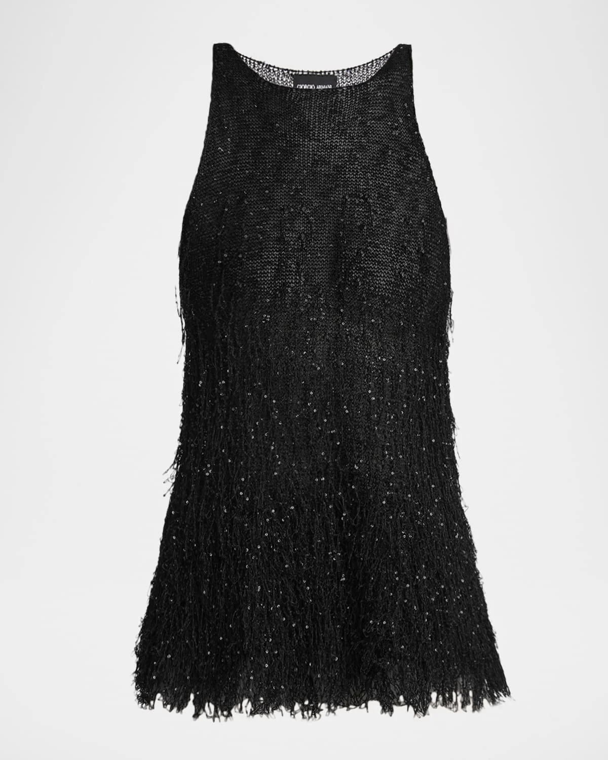 A stunning Giorgio Armani sheer net top featuring a micro-beaded construction and a long, heavy fringe that creates a liquid-like drape. Round neckline Sleeveless Racerback Hip length Slim fit Pullover style Nylon/polyamide/polyester/viscose Dry clean Made in Italy
